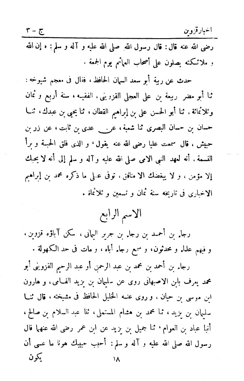 رجاء بْن أحمد بْن محمد بْن عَبْد الرحمن أو عَبْد الرحيم القزويني أَبُو محمد يعرف بابن الأصبهاني روى عن سليمان بْن يزيد الفامي وهارون ابن موسى بْن حيان وروى عَنْهُ الخليل الحافظ في مشيخته قَالَ ثَنَا سُلَيْمَانُ بْنُ يَزِيدَ ثَنَا مُحَمَّدُ بْنُ هِشَامٍ الْمُسْتَمْلِيُّ ثَنَا عَبْدُ السَّلامِ بْنُ صَالِحٍ أنبا عَبَّادُ بْنُ الْعَوَّامِ ثَنَا جَمِيلُ بْنُ يَزِيدَ عَنِ ابْنِ عُمَرَ رَضِيَ اللَّهُ عَنْهُمَا قَالَ رَسُولُ اللَّهِ صَلَّى اللَّهُ عَلَيْهِ وَآلِهِ وَسَلَّمَ: "أَحْبِبْ حَبِيبَكَ هَوْنًا مَا عسى أن