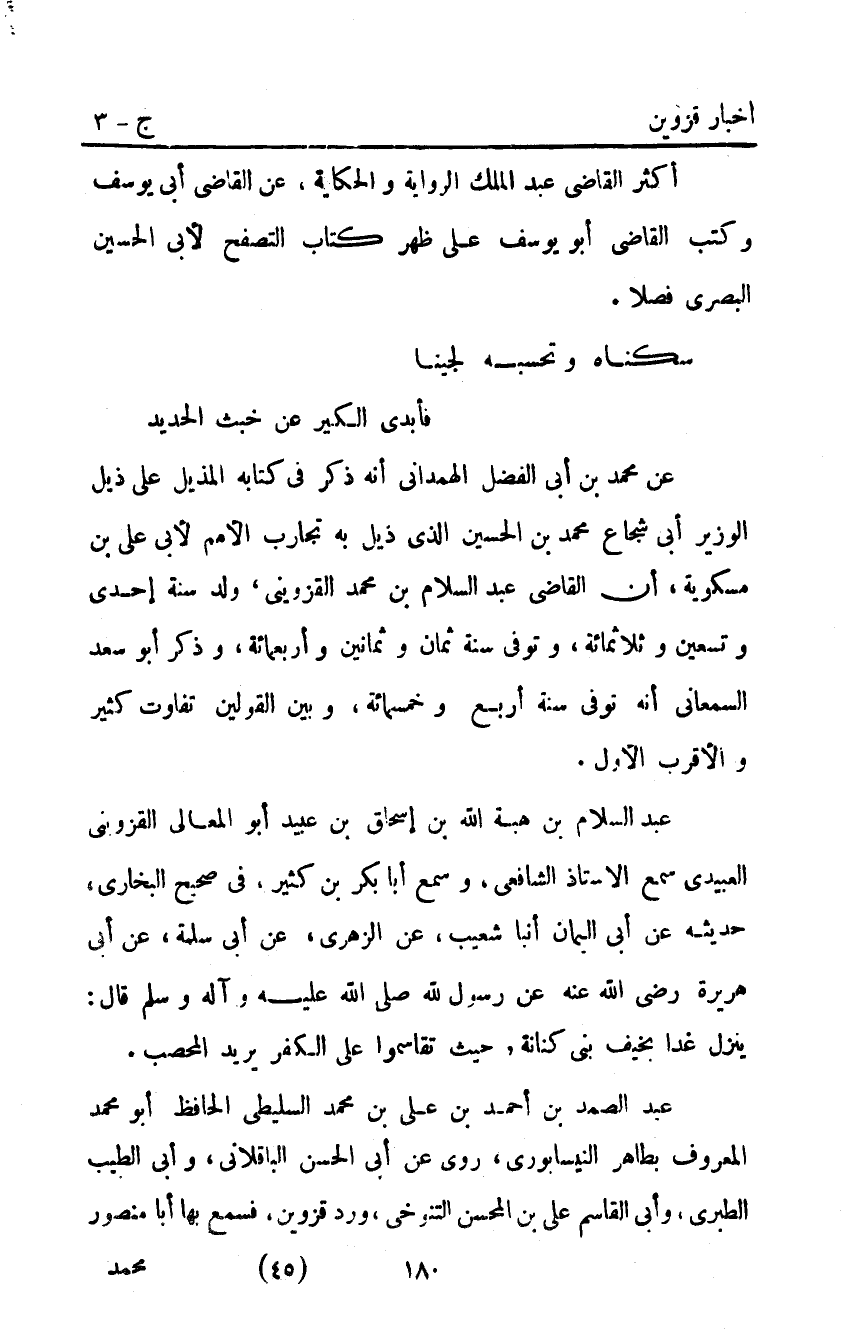 عَبْدُ السَّلامِ بْنُ هِبَةِ اللَّهِ بْنِ إِسْحَاقَ بْنِ عُبَيْدٍ أَبُو الْمَعَالِي الْقَزْوِينِيُّ الْعُبَيْدِيُّ سَمِعَ الأُسْتَاذَ الشَّافِعِيَّ وَسَمِعَ أَبَا بَكْرِ بْنَ كَثِيرٍ فِي صَحِيحِ الْبُخَارِيِّ حَدِيثَهُ عَنْ أَبِي الْيَمَانِ أَنْبَأَ شُعَيْبٌ عَنِ الزُّهْرِيِّ عَنْ أَبِي سَلَمَةَ عَنْ أَبِي هُرَيْرَةَ رَضِيَ اللَّهُ عَنْهُ عَنْ رَسُولِ اللَّهِ صَلَّى اللَّهُ عَلَيْهِ وَآلِهِ وَسَلَّمَ قال: "ينزل غَدًا بِخَيْفِ بَنِي كِنَانَةَ حَيْثُ تقاسموا على الكفر" يريد المحصب.