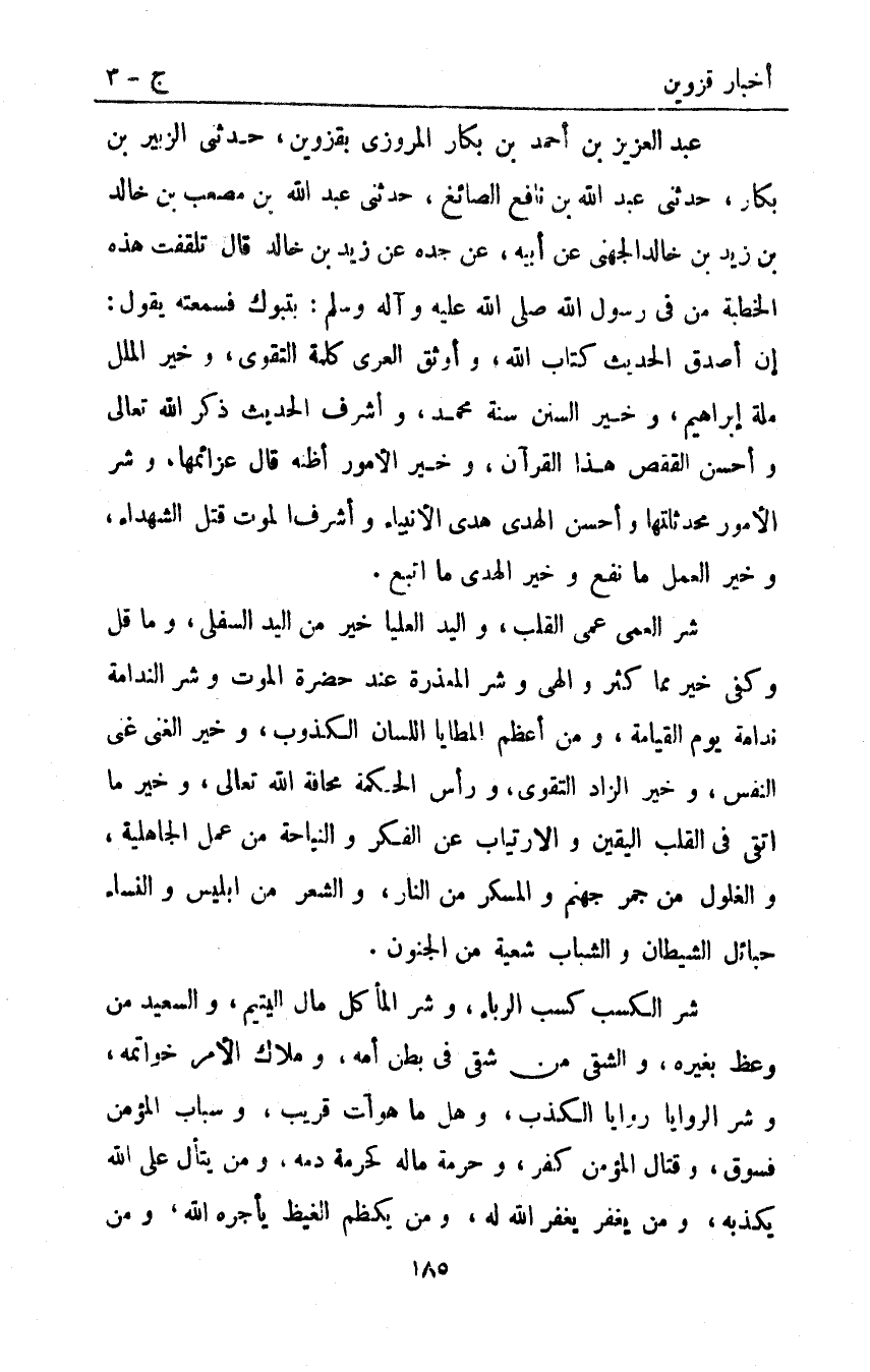 عَبْدُ الْعَزِيزِ بْنُ أَحْمَدَ بْنِ بَكَّارٍ الْمَرْوَزِيُّ بِقَزْوِينَ حَدَّثَنِي الزُّبَيْرُ بْنُ بَكَّارٍ حَدَّثَنِي عَبْدُ اللَّهِ بْنُ نَافِعٍ الصَّائِغُ حَدَّثَنِي عَبْدُ اللَّهِ بْنُ مُصْعَبِ بْنِ خَالِدِ بْنِ زَيْدِ بْنِ خَالِدٍ الْجُهَنِيُّ عَنْ أَبِيهِ عَنْ جَدِّهِ عَنْ زَيْدِ بْنِ خَالِدٍ قَالَ تَلَقَّفْتُ هَذِهِ الْخُطْبَةَ مِنْ فِي رَسُولِ اللَّهِ صَلَّى اللَّهُ عَلَيْهِ وَآلِهِ وَسَلَّمَ بِتَبُوكَ فَسَمِعْتُهُ يَقُولُ: "إِنَّ أَصْدَقَ الْحَدِيثِ كِتَابُ اللَّهِ وَأَوْثَقَ الْعُرَى كَلِمَةُ التَّقْوَى وَخَيْرَ الْمِلَلِ مِلَّةُ إِبْرَاهِيمَ وَخَيْرَ السُّنَنِ سُنَةُ مُحَمَّدٍ وَأَشْرَفَ الْحَدِيثِ ذِكْرُ اللَّهِ تَعَالَى وَأَحْسَنَ الْقَصَصِ هَذَا الْقُرْآنُ وَخَيْرَ الأُمُورِ أَظُنُّهُ قَالَ عَزَائِمُهَا وَشَرَّ الأُمُورِ مُحْدَثَاتُهَا وَأَحْسَنَ الْهُدَى هُدَى الأَنْبِيَاءِ وَأَشْرَفَ الْمَوْتِ قَتْلُ الشُّهَدَاءِ وَخَيْرَ الْعَمَلِ مَا نَفَعَ وَخَيْرَ الْهُدَى مَا اتُّبِعَ.