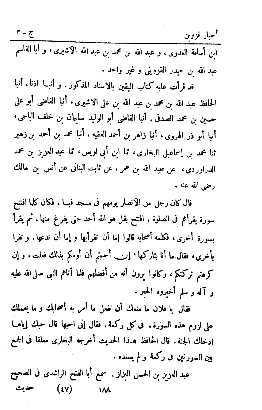 قَدْ قَرَأْتُ عَلَيْهِ كِتَابَ الْيَقِينِ بِالإِسْنَادِ الْمَذْكُورِ وَأنبا إِذْنًا أنبا الْحَافِظُ عَبْدُ اللَّهِ بْنُ مُحَمَّدِ بْنِ عَبْدِ اللَّهِ بْنِ عَلِيٍّ الأَشِيرِيُّ أنبا الْقَاضِي أَبُو عَلِيٍّ حُسَيْنُ بْنُ مُحَمَّدٍ الصَّدَفِيُّ أنبا الْقَاضِي أَبُو الْوَلِيدِ سُلَيْمَانُ بْنُ خَلَفٍ الْبَاجِيُّ أنبا أَبُو ذَرٍّ الْهَرَوِيُّ أَنْبَأَ زَاهِرُ بْنُ أَحْمَد الْفَقِيهُ أَنْبَأَ مُحَمَّدُ بْنُ أَحْمَدَ بْنِ زُهَيْرٍ ثَنَا مُحَمَّدُ بْنُ إِسْمَاعِيل الْبُخَارِيُّ ثَنَا ابْنُ أَبِي أُوَيْسٍ ثنا عَبْدُ الْعَزِيزِ بْنُ مُحَمَّدٍ الدَّرَاوَرْدِيُّ عَنْ عُبَيْدِ اللَّهِ بْنِ عُمَرَ عَنْ ثَابِتٍ الْبُنَانِيِّ عَنْ أَنَسِ بْنِ مَالِكٍ رَضِيَ اللَّهُ عَنْهُ. قَالَ كَانَ رَجُلٌ مِنَ الأَنْصَارِ يَؤُمُّهُمْ فِي مَسْجِدِ قُبَاءَ فكان كلما افتتح سورة يقرأهم فِي الصَّلاةِ افْتَتَحَ بِقُلْ هُوَ الله أحد حتى يفرغ مِنْهَا ثُمَّ يَقْرَأَ بِسُورَةٍ أُخْرَى فَكَلَّمَهُ أَصْحَابُهُ قَالُوا إِمَّا أَنْ تَقْرَأَ بِهَا وَإِمَّا أَنْ تَدَعَهَا وتقرأ بأخرى فقال: ما أَنَا بِتَارِكِهَا إِنْ أَحْبَبْتُمْ أَنْ أَؤُمَّكُمْ بِذَلِكَ فَعَلْتُ وَإِنْ كَرِهْتُمْ تَرَكْتُكُمْ وَكَانُوا يَرَوْنَ أَنَّهُ مِنْ أَفْضَلِهِمْ فَلَمَّا أَتَاهُمُ النَّبِيُّ صَلَّى الله عليه وآله وَسَلَّمَ أَخْبَرُوهُ الْخَبَرَ.
