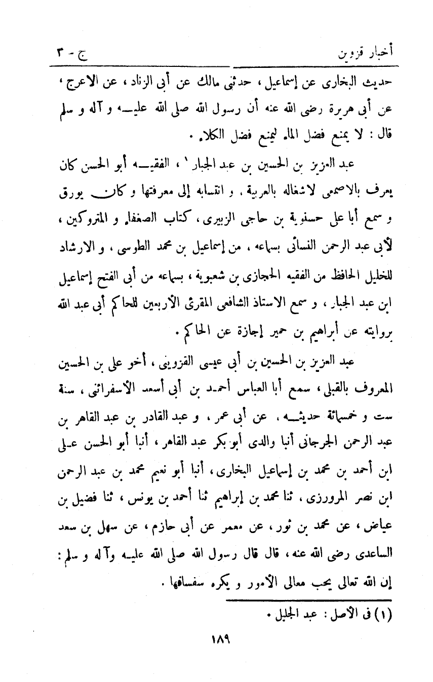 عَبْدُ الْعَزِيزِ بْنُ الْحُسَيْنِ بْنِ أَبِي عِيسَى الْقَزْوِينِيُّ أَخُو عَلِيِّ بْنِ الْحُسَيْنِ الْمَعْرُوفُ بِالْقَبَلِيِّ سَمِعَ أَبَا الْعَبَّاسِ أَحْمَد بْنَ أَبِي أَسْعَدَ الأسفرائني سنة ست وخمسمائة حَدِيثُهُ عَنْ أَبِي عُمَرَ وَعَبْدِ القادر بْن عَبْدِ القاهر بْن عَبْدِ الرَّحَمْنِ الْجُرْجَانِيِّ أنبا وَالِدِي أَبُو بَكْرٍ عَبْدُ الْقَاهِرِ أنبا أبو الحسن علي ابن أحمد بْن محمد بْن إِسْمَاعِيل الْبُخَارِيُّ أنبا أَبُو نُعَيْمٍ محمد بن عبد الرحمن ابن نصر المرورزي ثَنَا مُحَمَّدُ بْنُ إبراهيم ثَنَا أَحْمَد بْنُ يُونُسَ ثَنَا فُضَيْلُ بْنُ عِيَاضٍ عَنْ مُحَمَّدِ بْنِ ثَوْرٍ عَنْ مَعْمَرٍ عَنْ أَبِي حَازِمٍ عَنْ سَهْلِ بْنِ سَعْدٍ السَّاعِدِيِّ رَضِيَ اللَّهُ عَنْهُ قَالَ قَالَ رَسُولُ اللَّهِ صَلَّى اللَّهُ عَلَيْهِ وَآلِهِ وَسَلَّمَ: "إِنَّ اللَّهَ تَعَالَى يُحِبُّ مَعَالِي الأُمُورِ وَيَكْرَهُ سفسافها".