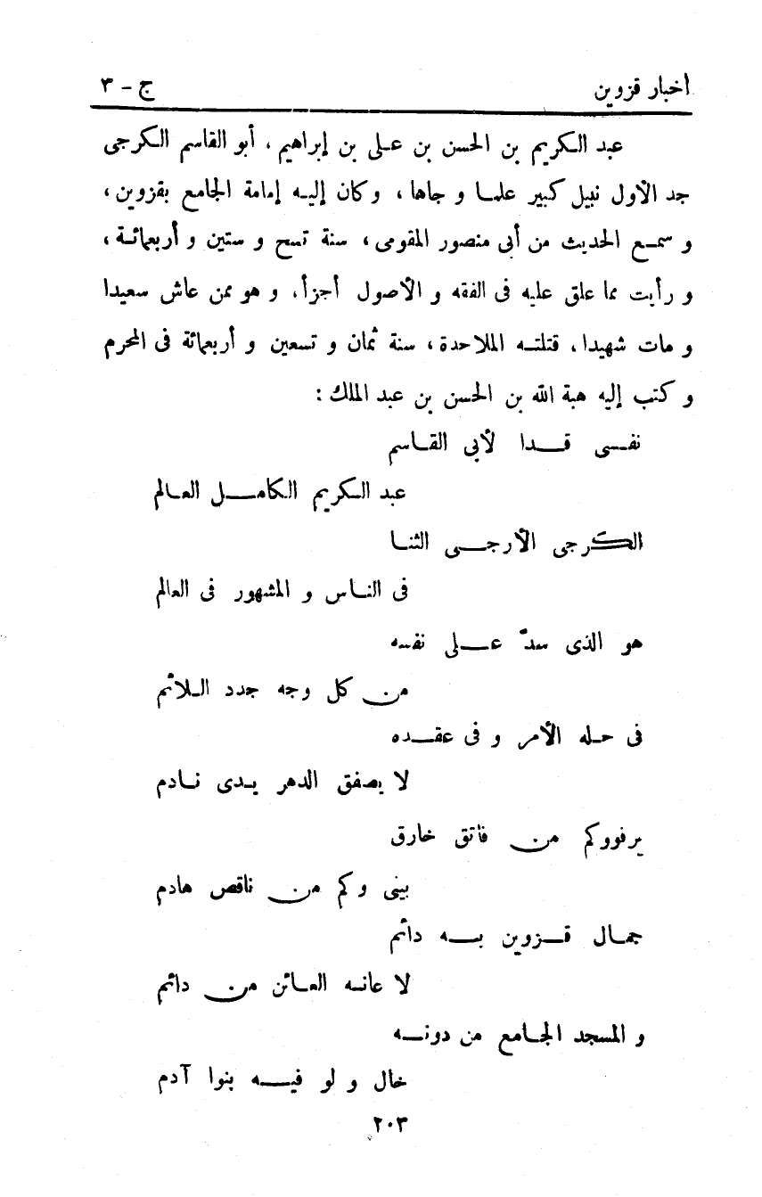 عَبْد الكريم بْن الحسن بْن علي بْن إبراهيم أَبُو القاسم الكري جد الأول نبيل كبير علما وجاها وكان إليه إمامة الجامع بِقَزْوِينَ وسمع الحديث من أبي منصور المقومي سنة تسح وستين وأربعمائة ورأيت مما علق عليه في الفقه والأصول أجزأ وهو ممن عاش سعيدا ومات شهيدا قتلته الملاحدة سنة ثمان وتسعين وأربعمائة في المحرم وكتب إليه هبة اللَّه بْن الحسن بْن عَبْدِ الملك: