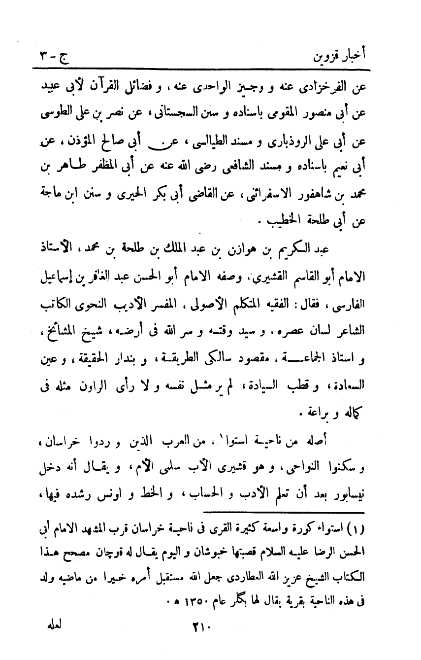1 استواء كورة واسعة كثيرة القرى في ناحية خراسان قرب المشهد الإمام أبي الحسن الرضا عليه السلام قصبتها خبوشان واليوم يقال له قوجان مصحح هذا الكتاب الشيخ عزيز الله العطاردي جعل الله مستقبل أمره خيرا من ماضيه ولد في هذه الناحية بقرية يقال لها بكلر عام 1350 هـ.