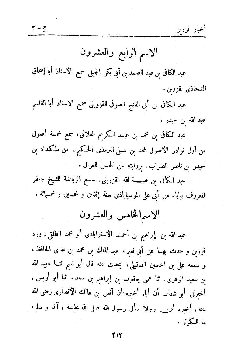 عَبْد الكافي بْن محمد بْن عَبْد الكريم العلاني سمع خمسة أصول من أول نوادر الأصول لمحد بْن علي الترمذي الحكيم من ملكداد بْن حيدر بْن ناصر الضراب بروايته عن الحسن الغزال. عَبْد الكافي بْن هبة اللَّه القزويني سمع الرياضة للشيخ جعفر المعروف ببابا من أبي علي الموسياباذي سنة اثنتين وخمسين وخمسمائة.