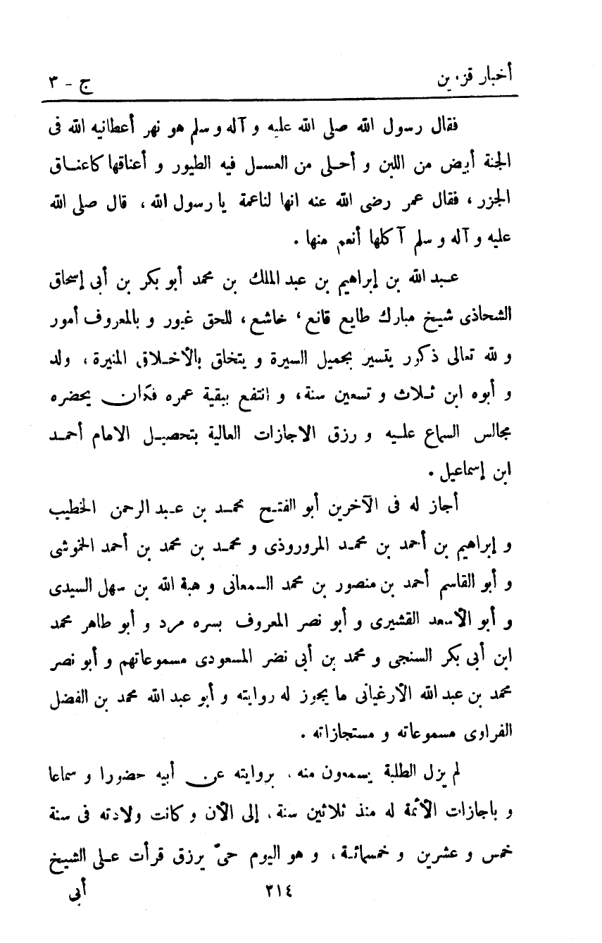 أجاز له في الآخرين أَبُو الْفَتْحِ مُحَمَّدُ بْنُ عَبْدِ الرحمن الخطيب وإبراهيم بْن أحمد بْن محمد المروروذي ومحمد بْن محمد بْن أحمد الخموشي وأبو القاسم أحمد بْن منصور بْن محمد السمعاني وهبة اللَّه بْن سهل السيدي وأبو الأسعد القشيري وأبو نصر المعروف بسره مرد وأبو طاهر محمد ابن أبي بكر السنجي ومحمد بْن أبي نضر المسعودي مسموعاتهم وأبو نصر مُحَمَّد بْن عَبْدِ اللَّهِ الأرغياني مَا يجوز له روايته وَأَبُو عَبْدِ اللَّهِ مُحَمَّدُ بْنُ الفضل الفراوي مسموعاته ومستجازاته. لم يزل الطلبة يسمعون منه بروايته عن أبيه حضورا وسماعا وبإجازات الأئمة له منذ ثلاثين سنة إلى الآن وكانت ولادته في سنة خمس وعشرين وخمسمائة وهو اليوم حتى يرزق قرأت على الشيخ