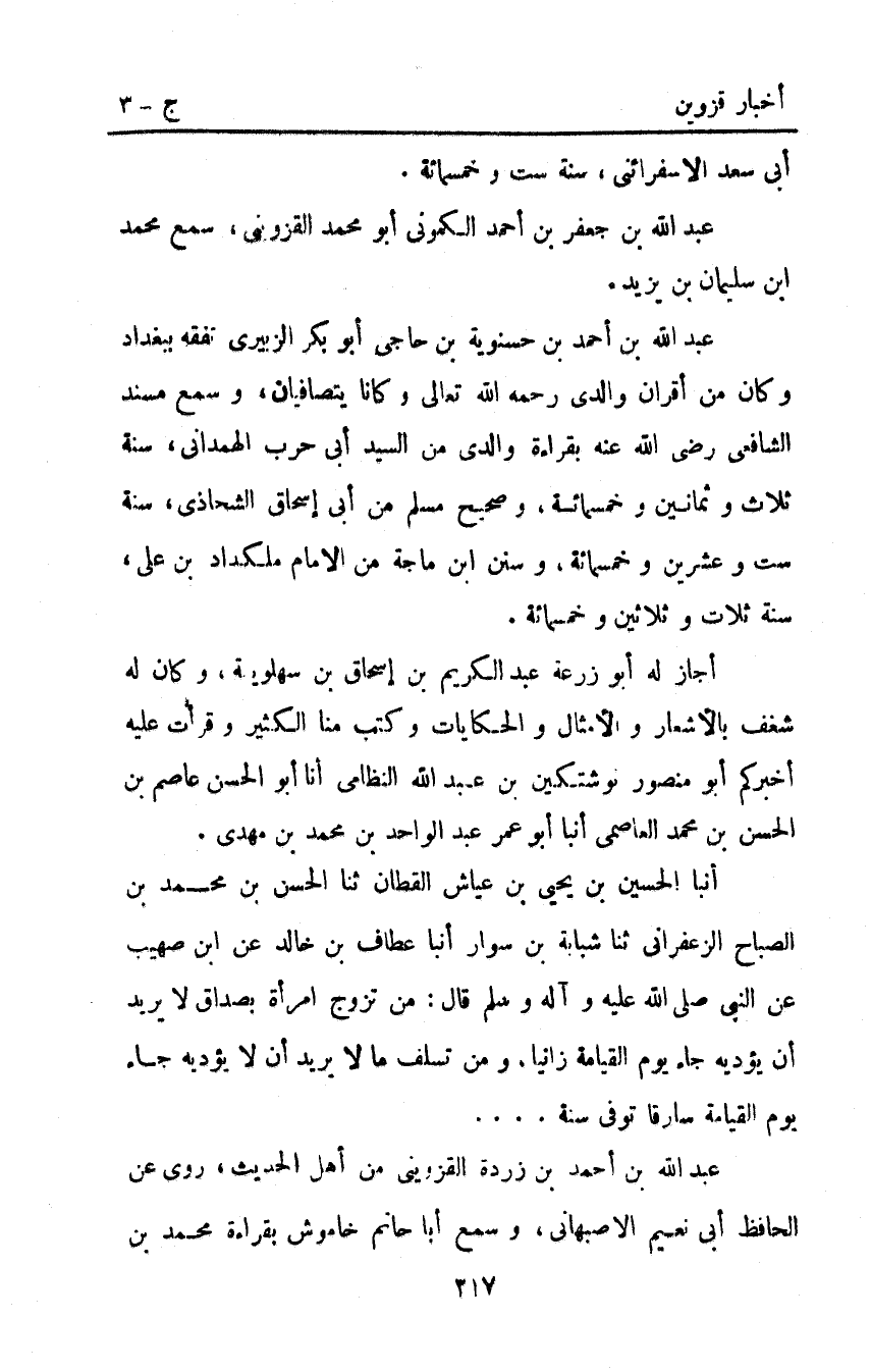 أجاز له أَبُو زرعة عَبْد الْكَرِيمِ بْنُ إِسْحَاقَ بْنِ سَهْلَوَيْهِ وكان له شغف بالأشعار والأمثال والحكايات وكتب منا الكثير وَقَرَأْتُ عَلَيْهِ أَخْبَرَكُمْ أَبُو مَنْصُورٍ نُوشَتْكِينُ بْنُ عُبَيْدِ اللَّهِ النِّظَامِيُّ أَنَا أَبُو الْحَسَنِ عَاصِمُ بْنُ الْحَسَنِ بْنِ مُحَمَّدٍ الْعَاصِمِيُّ أنبا أَبَا عمر عَبْد الواحد بْن مُحَمَّد بْنِ مَهْدِيٍّ. أنبا الْحُسَيْنُ بْنُ يَحْيَى بْنِ عَيَّاشٍ الْقَطَّانُ ثَنَا الْحَسَنُ بْنُ مُحَمَّدِ بْنِ الصَّبَّاحِ الزَّعْفَرَانِيُّ ثَنَا شَبَابَةُ بْنُ سَوَّارٍ أنبا عَطَّافُ بْنُ خَالِدٍ عَنِ ابْنِ صُهَيْبٍ عَنِ النَّبِيِّ صَلَّى اللَّه عليه وآله وسلم قَالَ: "مَنْ تَزَوَّجَ امْرَأَةً بِصَدَاقٍ لا يُرِيدُ أَنْ يُؤَدِّيَهُ جَاءَ يَوْمَ الْقِيَامَةِ زَانِيًا وَمَنْ تَسَلَّفَ مَالا يُرِيدُ أَنْ لا يُؤَدِّيهِ جَاءَ يوم القيامة سارقا". توفي سنة....