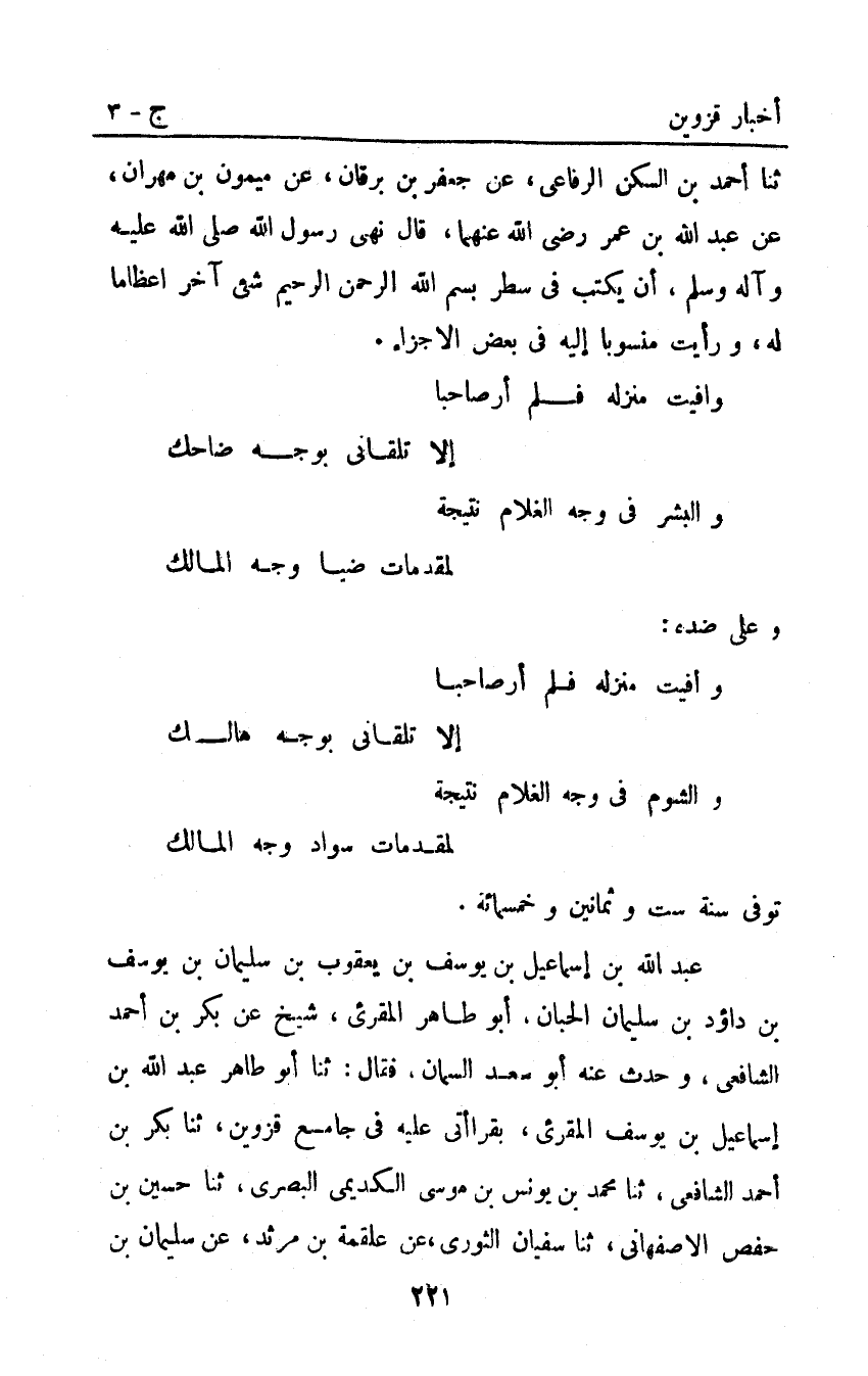 ثَنَا أَحْمَد بْنُ السَّكَنِ الرِّفَاعِيُّ عَنْ جَعْفَرِ بْنِ بُرْقَانَ عَنْ مَيْمُونِ بْنِ مِهْرَانَ عَنْ عَبْدِ اللَّهِ بْنِ عُمَرَ رَضِيَ اللَّهُ عَنْهُمَا قَالَ نَهَى رَسُولُ اللَّهِ أَنْ يُكْتَبَ فِي سَطْرٍ بِسْمِ الله الرحمن الرحيم شئ آخَرُ إِعْظَامًا لَهُ ورأيت منسوبا إليه في بعض الأجزاء.