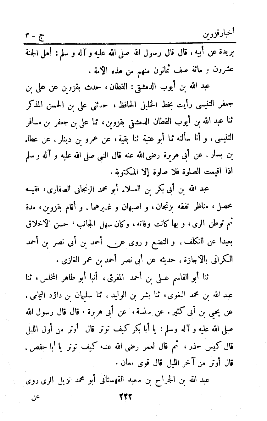 عَبْدُ اللَّهِ بْنُ أَيُّوبَ الدِّمَشْقِيُّ الْقَطَّانُ حَدَّثَ بِقَزْوِينَ عَنْ عَلِيِّ بْنِ جَعْفَرٍ التِّنِّيسِيِّ رَأَيْتُ بِخَطِّ الْخَلِيلِ الْحَافِظِ حَدَّثَنِي عَلِيُّ بْنُ الْحَسَنِ الْمُذَكِّرُ ثَنَا عَبْدُ اللَّهِ بْنُ أَيُّوبَ الْقَطَّانُ الدِّمَشْقِيُّ بِقَزْوِينَ ثَنَا عَلِيُّ بْنُ جَعْفَرِ بْنِ مُسَافِرٍ التِّنِّيسِيُّ وَأَنَا سَأَلْتُهُ ثَنَا أَبُو عُتْبَةَ ثَنَا بَقِيَّةُ عَنْ عَمْرِو بْنِ دِينَارٍ عَنِ عَطَاءِ بْنِ يَسَارٍ عَنْ أَبِي هُرَيْرَةَ رَضِيَ اللَّهُ عَنْهُ قَالَ النَّبِيَّ صَلَّى اللَّهُ عَلَيْهِ وَآلِهِ وَسَلَّمَ: "إِذَا أُقِيمَتِ الصَّلاةُ فَلا صَلاةَ إِلا الْمَكْتُوبَةَ".