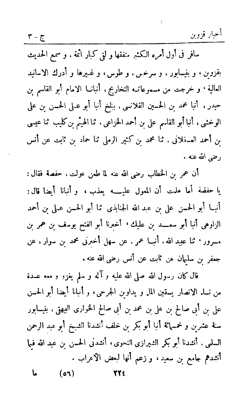 سافر في أول أمره الكثير متفقها ولقي كبار أئمة وسمع الحديث بقزوين وبنيسابور وسرخس وطوس وغيرها وأدرك الأسانيد العالية وخرجت من مسموعاته التخاريج أَنْبَأَنَا الإِمَامُ أَبُو الْقَاسِمِ بْنُ حَيْدَرٍ أنبا مُحَمَّدُ بْنُ الْحُسَيْنِ الْقَلانِسِيُّ بِبَلْخَ أَنْبَأَ أَبُو عَلِيٌّ الْحَسَنُ بْنُ عَلِيٍّ الْوَخْشِيُّ أنبا أَبُو الْقَاسِمِ عَلِيُّ بْنُ أَحْمَد الْخُزَاعِيُّ ثَنَا الْهَيْثَمُ بْنُ كُلَيْبٍ ثَنَا عِيسَى بْنُ أَحْمَد الْعَسْقَلانِيُّ ثَنَا مُحَمَّدُ بْنُ كَثِيرٍ الرَّمْلِيُّ ثَنَا حَمَّادُ بْنُ ثَابِتٍ عَنْ أَنَسٍ رَضِيَ اللَّهُ عَنْهُ.