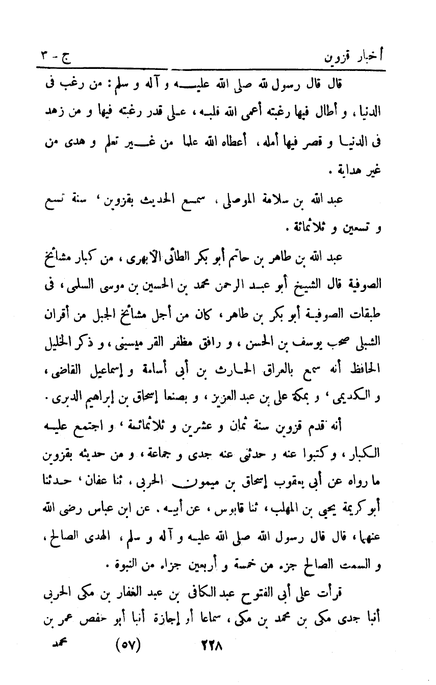 أنه قدم قزوين سنة ثمان وعشرين وثلاثمائة واجتمع عليه الكبار وكتبوا عَنْهُ وحدثني عَنْهُ جدي وجماعة ومن حديثه بقزوين مَا رَوَاهُ عَنْ أَبِي يَعْقُوبَ إِسْحَاقَ بْنِ مَيْمُونٍ الْحَرْبِيِّ ثَنَا عَفَّانُ حَدَّثَنَا أَبُو كَرِيمَةَ يَحْيَى بْنُ الْمُهَلَّبِ ثَنَا قابوس عن أبيه عن ابن عَبَّاسٍ رَضِيَ اللَّهُ عَنْهُمَا قَالَ قَالَ رَسُولُ اللَّهِ صَلَّى اللَّهُ عليه وآله وَسَلَّمَ: "الْهُدَى الصَّالِحُ وَالسَّمْتُ الصَّالِحُ جزء من خمسة وأربعين جزاء مِنَ النُّبُوَّةِ".