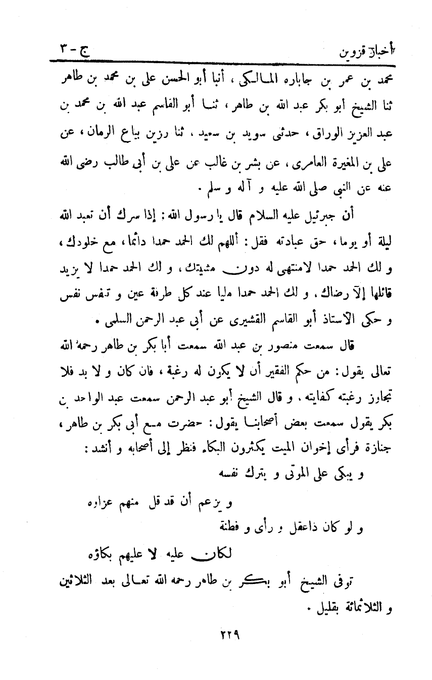 مُحَمَّدِ بْنِ عُمَرَ بْنِ جَابَارَهْ الْمَالِكِيُّ أنبا أَبُو الْحَسَنِ عَلِيُّ بْنُ مُحَمَّدِ بْنِ طَاهِرٍ ثَنَا الشَّيْخُ أَبُو بَكْرٍ عَبْدُ اللَّهِ بْنُ طَاهِرٍ ثَنَا أَبُو الْقَاسِمِ عَبْدُ اللَّهِ بْنُ مُحَمَّدِ بْنِ عَبْدِ الْعَزِيزِ الْوَرَّاقُ حَدَّثَنِي سُوَيْدُ بْنُ سَعِيدٍ ثَنَا رَزِينٌ بَيَّاعُ الرُّمَّانِ عَنْ عَلِيِّ بْنِ الْمُغِيرَةِ الْعَامِرِيِّ عَنْ بِشْرِ بْنِ غَالِبٍ عَنْ عَلِيِّ بْنِ أَبِي طَالِبٍ رضي اللَّه عنه عن النبي صَلَّى اللَّهُ عَلَيْهِ وَآلِهِ وَسَلَّمَ.