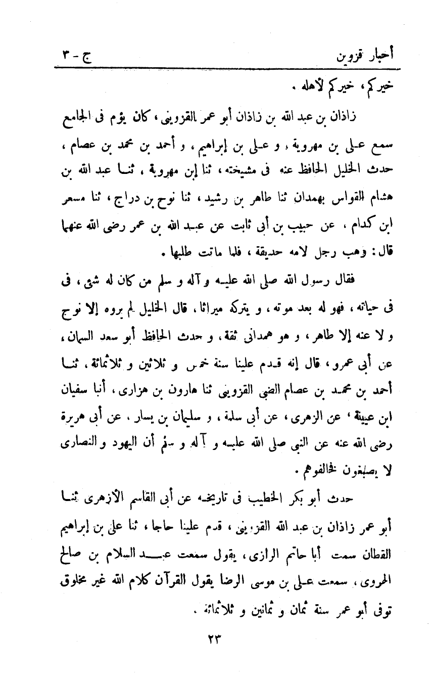 زاذان بْن عَبْد اللَّه بْن زاذان أبو عمر القزويني كان يؤم في الجامع سمع علي بن معروية وعلي بْن إبراهيم وأحمد بْن محمد بْن عصام حدث الخليل الحافظ عَنْهُ في مشيخته ثَنَا ابْنُ مَهْرَوَيْهِ ثَنَا عَبْدُ اللَّهِ بْنُ هِشَامٍ الْقَوَّاسُ بِهَمْدَانَ ثَنَا طَاهِرُ بْنُ رَشِيدٍ ثَنَا نُوحُ بن دراج ثنا مسعر ابن كِدَامٍ عَنْ حَبِيبِ بْنِ أَبِي ثَابِتٍ عَنْ عَبْدِ اللَّهِ بْنِ عُمَرَ رَضِيَ اللَّهُ عَنْهُمَا قَالَ: وَهَبَ رَجُلٌ لِأُمِّهِ حَدِيقَةً فَلَمَّا مَاتَتْ طَلَبَهَا.