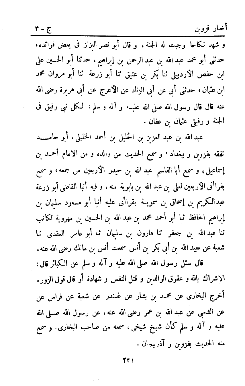 قَالَ سُئِلَ رَسُولُ اللَّهِ صَلَّى اللَّهُ عَلَيْهِ وَآلِهِ وَسَلَّمَ عَنِ الْكَبَائِرِ قَالَ: "الإِشْرَاكُ بِاللَّهِ وَعُقُوقُ الْوَالِدَيْنِ وَقَتْلُ النَّفْسِ وَشَهَادَةُ أَوْ قَالَ قَوْلُ الزُّورِ" أَخْرَجَ الْبُخَارِيُّ عَنْ مُحَمَّدِ بْنِ بَشَّارٍ عَنْ غُنْدَرٍ عَنْ شُعْبَةَ عَنْ فراس عن عن الشعبي عن عَبْد اللَّه بْن عمر رَضِيَ اللَّهُ عَنْهُ عَنْ رَسُولِ اللَّهِ صَلَّى اللَّهُ عليه وآله وَسَلَّمَ كَأَنَّ شَيْخَ شَيْخِي سَمِعَهُ مِنْ صَاحِبِ الْبُخَارِيِّ وَسَمِعَ مِنْهُ الحديث بقزوين وآذربيجان.