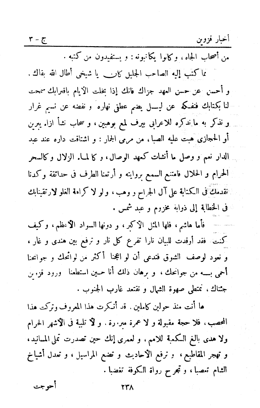 فأما هاشم فلها المثل الأكبر ودونها السواد الأعظم وكيف كنت فقد أوقدت للبيان نارا تفرع كل نار وترفع بين هندي وغار ونعود لوصف الشوق فتدعى أن لو أعجنا أكثر من لوائحك وجوانحنا أحمى به من جوانحك وبرهان ذلك أنا حين استطعنا ورود قزوين جئناك نمتطي صهوة الشمال ونقتعد غارب الجنوب.
