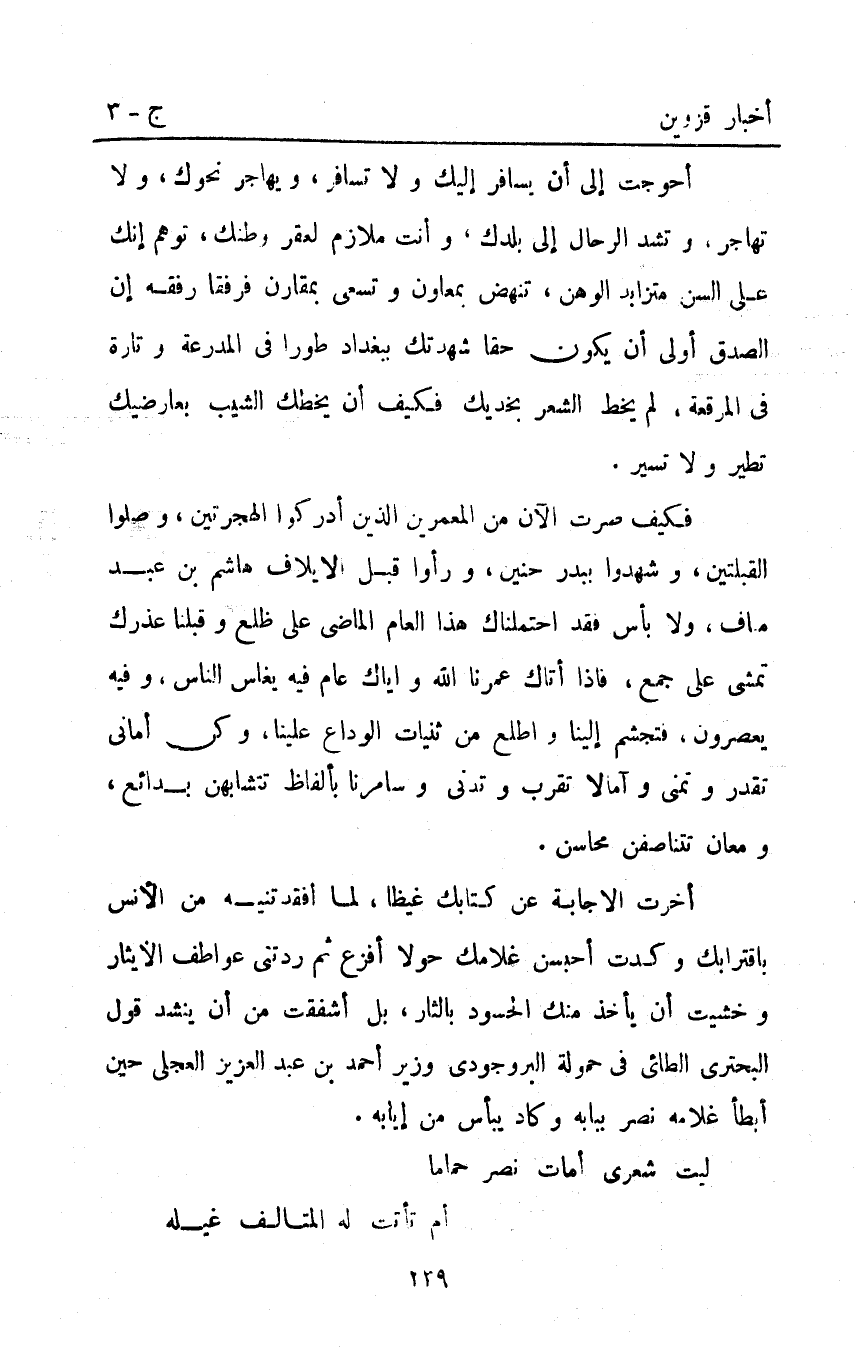 فكيف صرت الآن من المعمرين الذين أدركوا الهجرتين وصلوا القبلتين وشهدوا ببدر حنين ورأوا قبل الإيلاف هاشم بْن عبد مناف ولا بأس فقد احتملناك هذا العام الماضي على ظلع وقبلنا عذرك تمشى على جمع فإذا أتاك عمرنا اللَّه وإياك عام فيه يغاس الناس وفيه يعصرون فتجشم إلينا واطلع من ثنيات الوداع علينا وكن أماني تقدر وتمنى وآمالا تقرب وتدنى وسامرنا بألفاظ تتشابهن بدائع ومعان تتناصفن محاسن.
