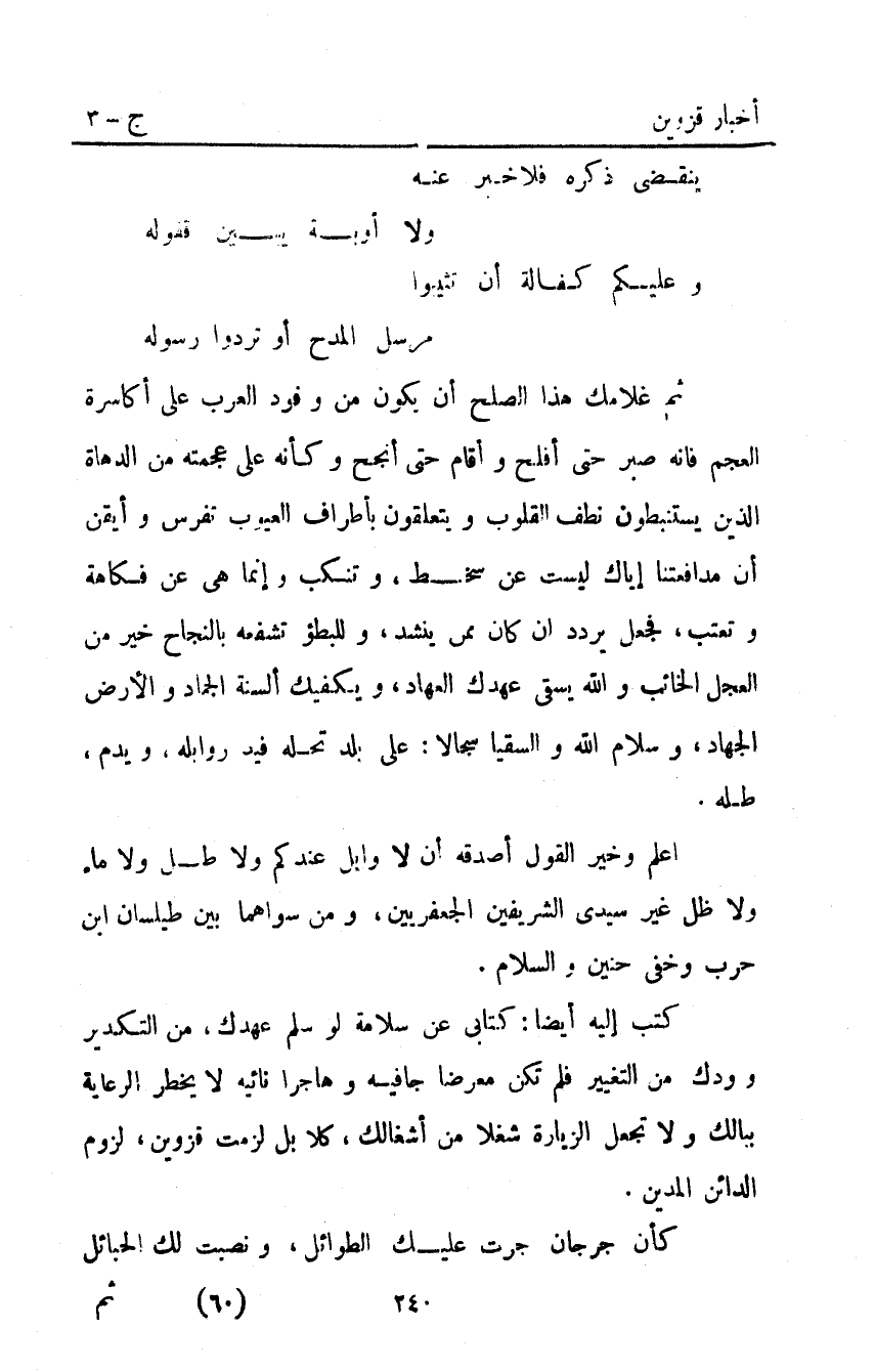 كتب إليه أيضا كتابي عن سلامة لو سلم عهدك من التكدير وودك من التغيير فلم تكن معرضا جافيه وهاجرا نائيه لا يحظر الرعاية ببالك ولا تجعل الزيارة شغلا من أشغالك كلا بل لزمت قزوين لزوم الدائن المدين.