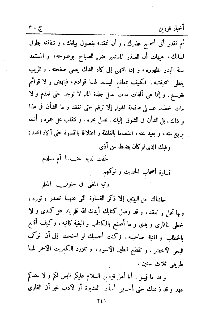 وقد مَا قيل: أيا أهل قزوين السلام عليكم فليس لكم ولا عندكم عهد وقد ذممتك حتى أحسبني أسأت العشيرة أو الأدب غير أن القارئ