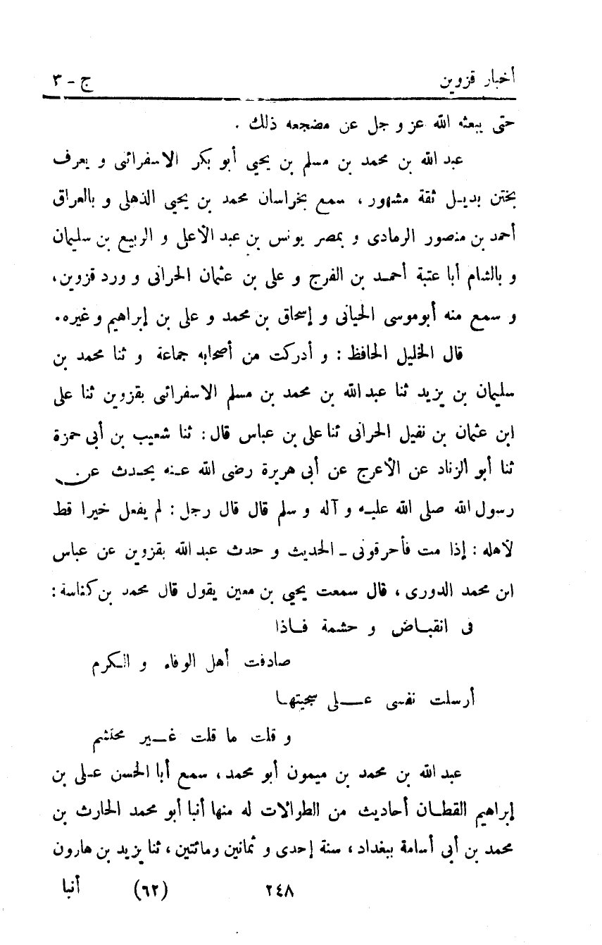 قَالَ الْخَلِيلُ الْحَافِظُ وَأَدْرَكْتُ مِنْ أَصْحَابِهِ جَمَاعَةً وَثَنَا مُحَمَّدُ بْنُ سُلَيْمَانَ بْنِ يَزِيدَ ثنا عَبْدُ اللَّهِ بْنُ محمد بن مسلم الاسفرائني بقزوين ثنا على ابن عُثْمَانَ بْنِ نُفَيْلٍ الْحَرَّانِيُّ ثَنَا عَلِيُّ بْنُ عَبَّاسٍ قَالَ ثَنَا شُعَيْبُ بْنُ أَبِي حَمْزَةَ ثَنَا أَبُو الزِّنَادِ عَنِ الأَعْرَجِ عَنْ أَبِي هُرَيْرَةَ رَضِيَ اللَّهُ عَنْهُ يُحَدِّثُ عَنْ رَسُولِ اللَّهِ صَلَّى اللَّه عليه وآله وسلم قَالَ: "قَالَ رَجُلٌ لَمْ يَفْعَلْ خَيْرًا قَطُّ لأَهْلِهِ إِذَا مِتُّ فَأحْرِقُونِي" الْحَدِيثَ وحدث عَبْد اللَّهِ بقزوين عن عباس ابن محمد الدوري قَالَ سمعت يحيى بْن معين يقول قَالَ محمد بْن كناسة:
