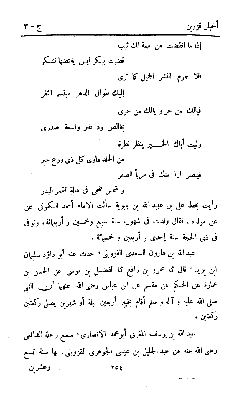 رأيت بخط علي بْن عبيد اللَّه بْن بابويه سألت الإمام أحمد الكموني عن عن مولده فقال ولدت في شهور سنة سبع وخمسين وأربعمائة وتوفى في ذي الحجة سنة إحدى وأربعين وخمسمائة. عبد اللَّهِ بْنُ هَارُونَ السَّعْدِيُّ الْقَزْوِينِيُّ حدث عنه أبو داؤد سليمان ابن يَزِيدَ قَالَ ثَنَا عَمْرُو بْنُ رَافِعٍ ثنا الْفَضْلُ بْنُ مُوسَى عَنِ الْحَسَنِ بْنِ عُمَارَةَ عَنِ الْحَكَمِ عَنْ مِقْسَمٍ عَنِ ابْنِ عَبَّاسٍ رَضِيَ اللَّهُ عَنْهُمَا أَنَّ النَّبِيَّ صَلَّى اللَّهُ عَلَيْهِ وَآلِهِ وَسَلَّمَ أَقَامَ بِخَيْبَرَ أَرْبَعِينَ لَيْلَةً أَوْ شَهْرَيْنِ يُصَلِّي رَكْعَتَيْنِ رَكْعَتَيْنِ.