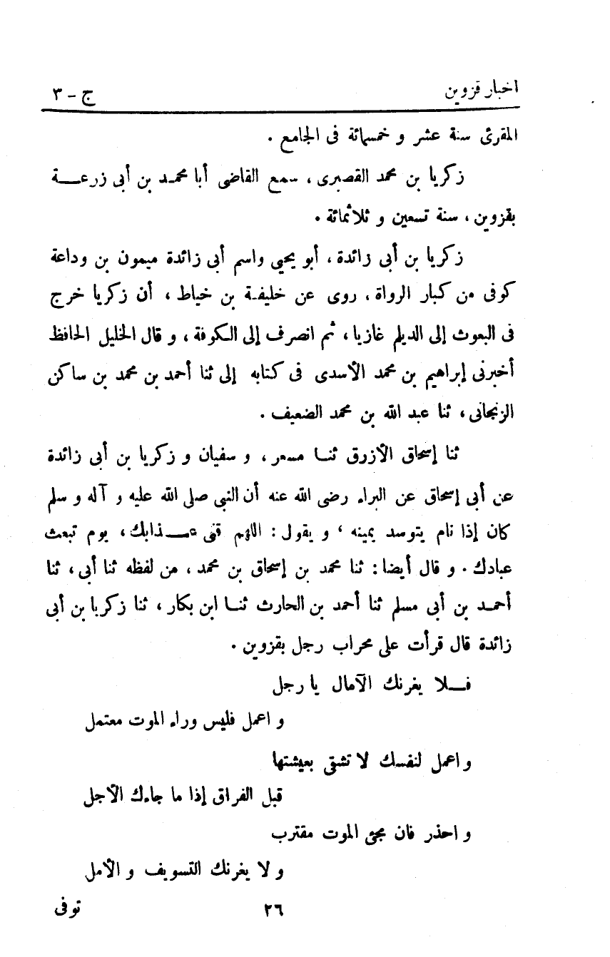 ثَنَا إِسْحَاقُ الأَزْرَقُ ثَنَا مِسْعَرٌ وَسُفْيَانُ وَزَكَرِيَّا بْنُ أَبِي زَائِدَةَ عَنْ أَبِي إِسْحَاقَ عَنِ الْبَرَاءِ رَضِيَ اللَّهُ عَنْهُ أَنَّ النَّبِيَّ صَلَّى اللَّهُ عَلَيْهِ وَآلِهِ وَسَلَّمَ كَانَ إِذَا نَامَ يَتَوَسَّدُ يَمِينَهُ وَيَقُولُ: "اللَّهُمَّ قِنِي عَذَابَكَ يَوْمَ تَبْعَثُ عِبَادَكَ".وقال أيضا: ثنا محمد بْن إسحاق بْن محمد من لفظه ثنا أبي ثنا أحمد بْن أبي مسلم ثنا أحمد بْن الحارث ثنا ابن بكار ثنا زكريا بْن أبي زائدة قَالَ قرأت على محراب رجل بقزوين.