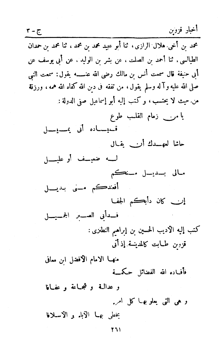 مُحَمَّدِ بْنِ أَخِي هِلالٍ الرَّازِيُّ ثَنَا أَبُو عُبَيْدٍ مُحَمَّدُ بْنُ مُحَمَّدٍ ثَنَا مُحَمَّدُ بْنُ حَمْدَانَ الطَّيَالِسِيُّ ثَنَا أَحْمَد بْنُ الصَّلْتِ عَنْ بِشْرِ بْنِ الْوَلِيدِ عَنْ أَبِي يُوسُفَ عَنْ أَبِي حَنِيفَةَ قَالَ سَمِعْتُ أَنَسَ بْنَ مَالِكٍ رَضِيَ اللَّهُ عَنْهُ يَقُولُ سَمِعْتُ النَّبِيَّ صَلَّى اللَّهُ عَلَيْهِ وَآلِهِ وَسَلَّمَ يَقُولُ: "مَنْ تَفَقَّهَ فِي دِينِ اللَّهِ كَفَاهُ اللَّهُ هَمَّهُ وَرِزْقَهُ مِنْ حَيْثُ لا يَحْتَسِبُ" وكتب إليه أَبُو إسماعيل صفى الدولة: