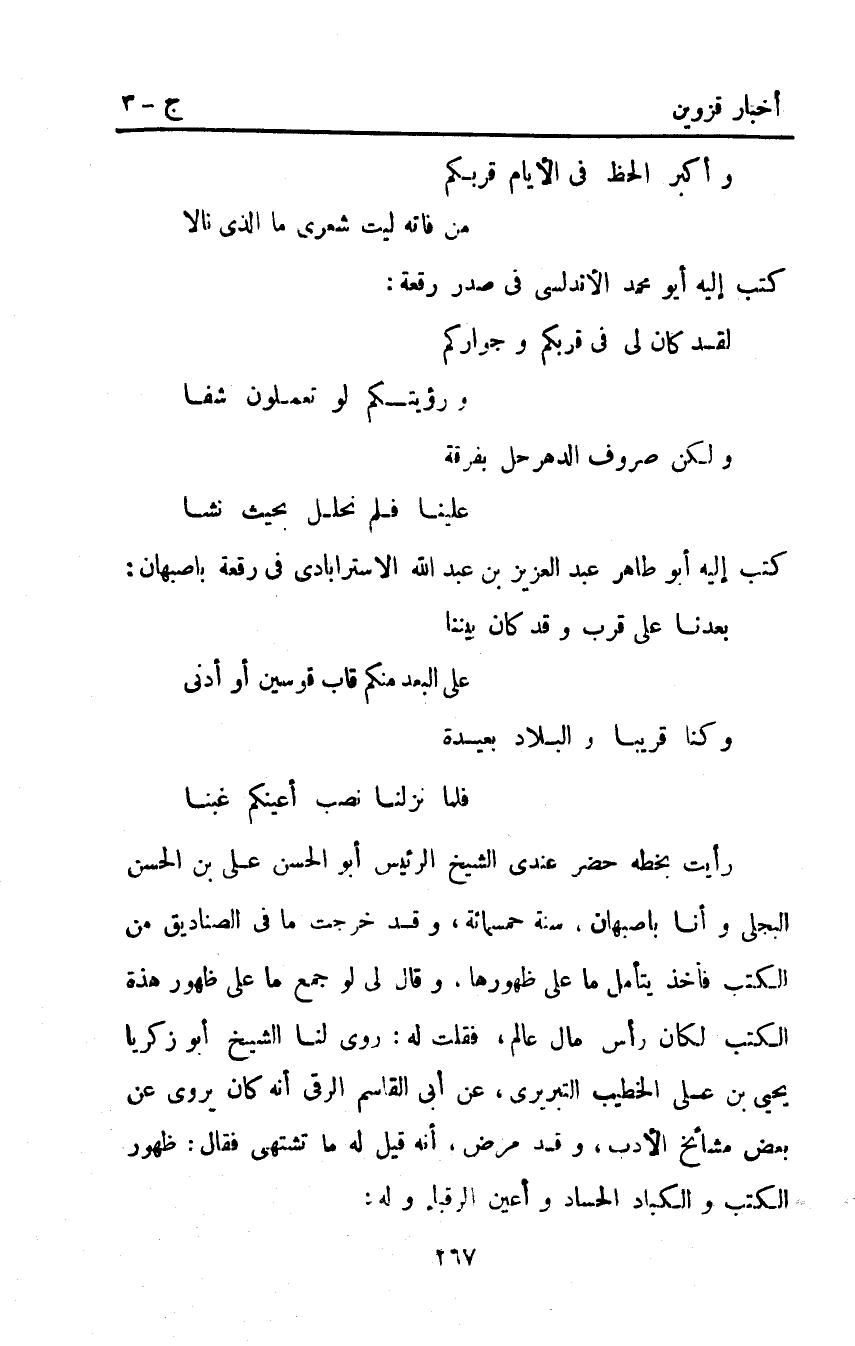 رأيت بخطه حضر عندي الشيخ الرئيس أَبُو الحسن علي بْن الحسن البجلي وأنا بأصبهان سنة خمسمائة وقد خرجت مَا في الصناديق من الكتب فأخذ يتأمل مَا على ظهورها وقال لي لو جمع مَا على ظهور هذه الكتب لكان رأس مال عالم فقلت له: روى لنا الشيخ أَبُو زكريا يحيى بْن علي الخطيب التبريري عن أبي القاسم الرقي أنه كان يروى عن بعض مشائخ الأدب وقد مرض أنه قيل له مَا تشتهي فقال ظهور الكتب والكباد الحساد وأعين الرقباء وله: