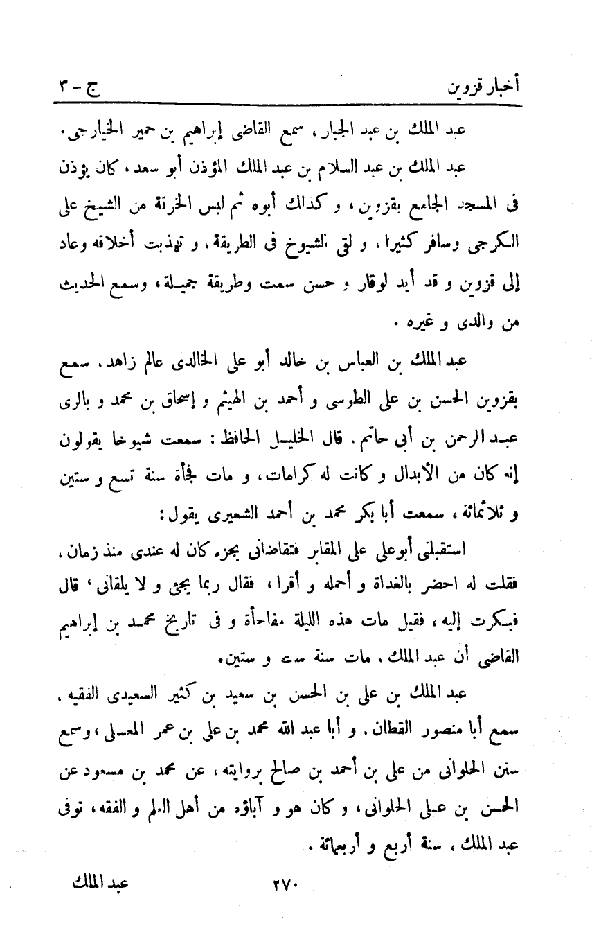 عَبْد الملك بْن العباس بْن خالد أَبُو علي الخالدي عالم زاهد سمع بقزوين الحسن بْن علي الطوسي وأحمد بْن الهيثم وإسحاق بْن مُحَمَّد وبالري عَبْد الرحمن بْن أبي حاتم قَالَ الخليل الحافظ: سمعت شيوخا يقولون إنه كان من الأبدال وكانت له كرامات ومات فجأة سنة تسع وستين وثلاثمائة سَمِعْتُ أَبَا بَكْرٍ مُحَمَّدَ بْنَ أحمد الشعيري يقول: