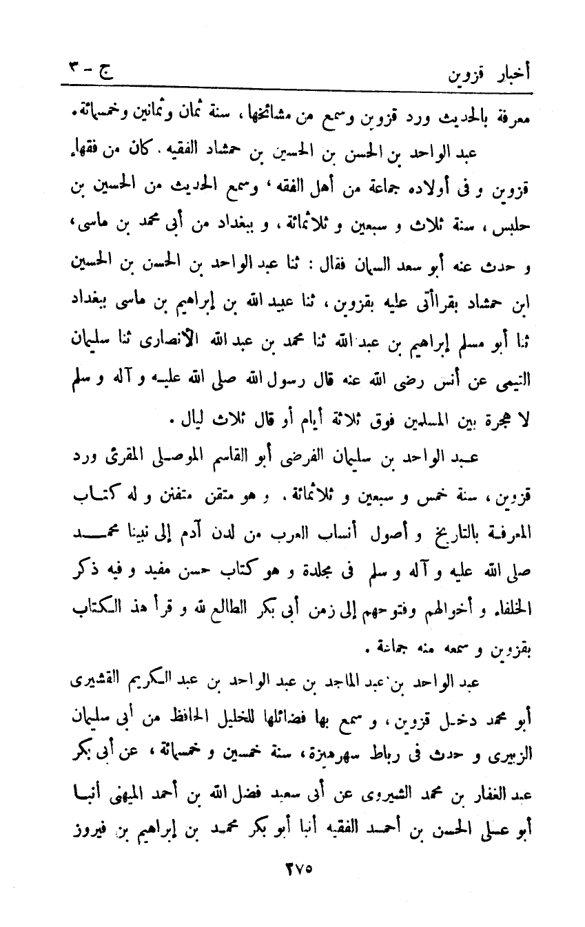 عَبْد الواحد بْن الحسن بْن الحسين بْن حمشاد الفقيه كان من فقهاء قزوين وفي أولاده جماعة من أهل الفقه وسمع الحديث من الحسين بْن حلبس سنة ثلاث وسبعين وثلاثمائة وببغداد من أبي محمد بْن ماسي وحدث عَنْهُ أَبُو سعد السمان فقال ثَنَا عَبْدُ الْوَاحِدِ بن الحسن بن الحسين ابن حمشاد بقراأتي عَلَيْهِ بِقَزْوِينَ ثَنَا عُبَيْدُ اللَّهِ بْنُ إبراهيم بْنِ مَاسِيٍّ بِبَغْدَادَ ثنا أَبُو مُسْلِمٍ إبراهيم بْنُ عَبْدِ اللَّهِ ثَنَا مُحَمَّدُ بْنُ عَبْدِ اللَّهِ الأَنْصَارِيُّ ثَنَا سُلَيْمَانُ التَّيْمِيُّ عَنْ أَنَسٍ رَضِيَ اللَّهُ عَنْهُ قَالَ رَسُولُ اللَّهِ صَلَّى اللَّهُ عَلَيْهِ وَآلِهِ وَسَلَّمَ: "لا هِجْرَةَ بَيْنَ الْمُسْلِمِينَ فَوْقَ ثَلاثَةِ أَيَّامٍ أَوْ قَالَ ثَلاثِ لَيَالٍ".