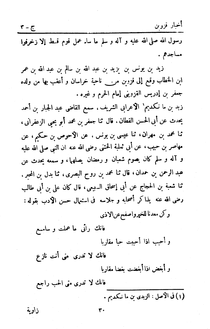 زيد بْن ما نكديم1 الأعرابي الشريف سمع القاضي عَبْد الْجَبَّارِ بْنِ أَحْمَد يُحَدِّثُ عَنْ أبي الحسن القطان قَالَ ثَنَا جَعْفَرُ بْنُ مُحَمَّدٍ أَبُو يَحْيَى الزَّعْفَرَانِيُّ ثَنَا مُحَمَّدُ بْنُ مِهْرَانَ ثنا عِيسَى بْنُ يُونُسَ عَنْ الأَحْوَصِ بْنِ حَكِيمٍ عَنْ مُهَاصِرِ بْنِ حَبِيبٍ عَنْ أَبِي ثَعْلَبَةَ الْخُشَنِيِّ رَضِيَ اللَّهُ عَنْهُ أَنَّ النَّبِيَّ صَلَّى اللَّهُ عَلَيْهِ وَآلِهِ وَسَلَّمَ كَانَ يَصُومُ شَعْبَانَ وَرَمَضَانَ يَصِلُهُمَا وسمعه يحدث عن عَبْد الرحمن بْن حمدان قَالَ ثنا محمد بْن روح البصري ثنا بدل بْن المحبر ثنا شعبة بْن الحجاج عن أبي إسحاق السبيعي قَالَ كان علي بْن أَبِي طَالِبٍ رَضِيَ اللَّهُ عَنْهُ يذاكر أصحابه وجلاسه في استعمال حسن الأدب بقوله: