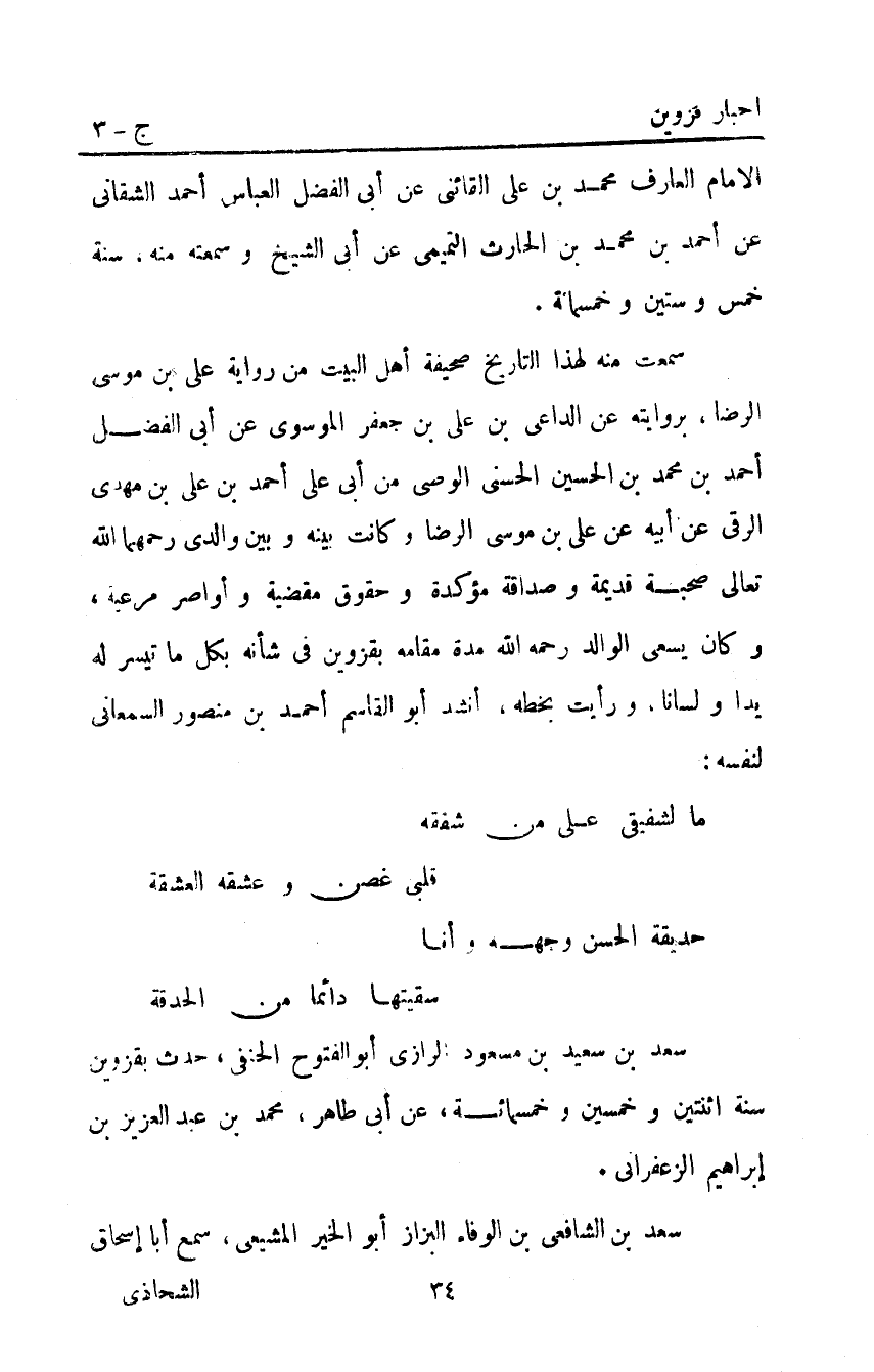 الإمام العارف محمد بْن علي القائني عن أبي الفضل العباس أحمد الشقاني عن أحمد بْن محمد بْن الحارث التميمي عن أبي الشيخ وسمعته منه سنة خمس وستين وخمسمائة. سمعت منه لهذا التاريخ صحيفة أهل البيت من رواية علي بْن موسى الرضا بروايته عن الداعي بْن علي بْن جعفر الموسوي عن أبي الفضل أحمد بْنِ مُحَمَّدِ بْنِ الْحُسَيْنِ الْحَسَنِيُّ الوصي من أبي علي أحمد بْن علي بْن مهدي الرقي عن أبيه عن علي بْن موسى الرضا وكانت بينه وبين والدي رحمهما الله تعالى صحبة قديمة وصداقة مؤكدة وحقوق مقضية وأواصر مرعبة وكان يسعى الوالد رحمه اللَّه مدة مقامة بقزوين في شأنه بكل مَا تيسر له يدا ولسانا ورأيت بخطه أنشد أَبُو القاسم أحمد بْن منصور السمعاني لنفسه: