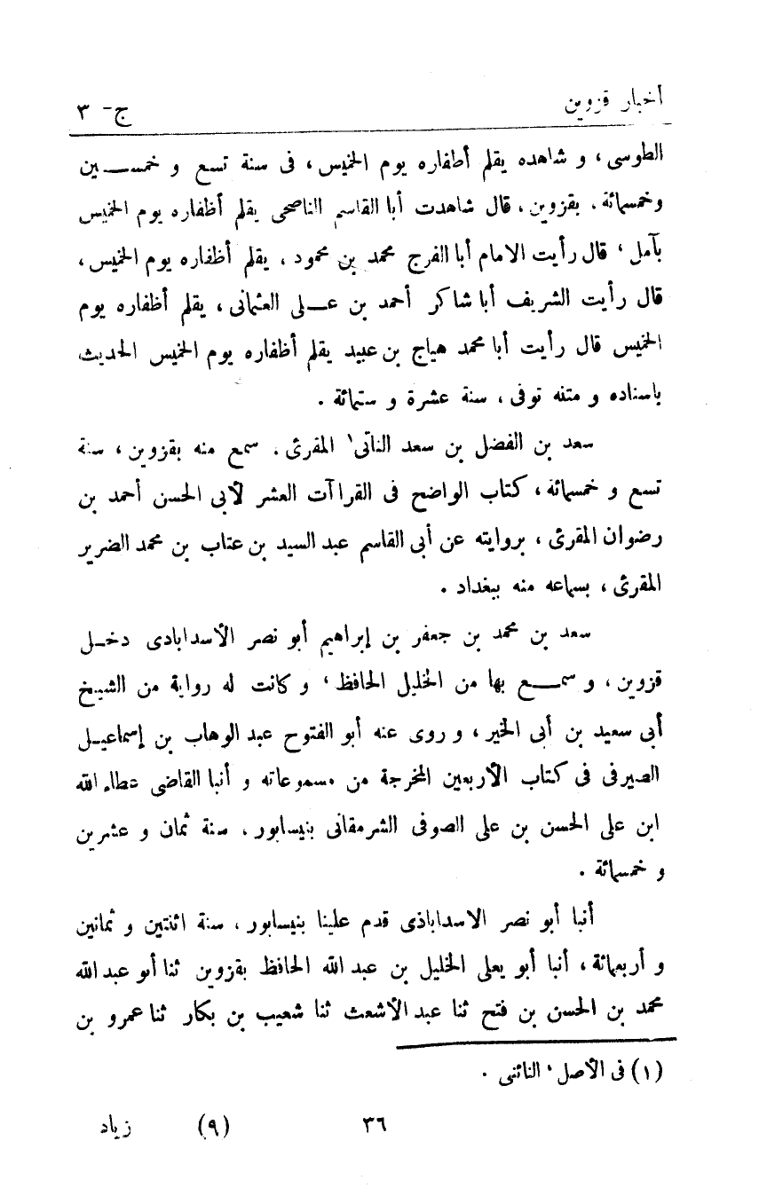 سعد بْن محمد بْن جعفر بْن إبراهيم أَبُو نصر الأسداباذي دخل قزوين وسمع بها من الخليل الحافظ وكانت له رواية من الشيخ أبي سعيد بْن أبي الخير وروى عَنْهُ أَبُو الفتوح عَبْد الوهاب بْن إسماعيل الصيرفي في كتاب الأربعين المخرجة من مسموعاته وأنبا القاضي عطاء الله ابن علي الحسن بْن علي الصوفي الشرمقاني بنيسابور سنة ثمان وعشرين وخمسمائة. أنبا أَبُو نَصْرٍ الأَسْدَابَاذِيُّ قَدِمَ عَلَيْنَا بِنَيْسَابُورَ سَنَةَ اثْنَتَيْنِ وَثَمَانِينَ وأربعمائة أنبا أَبُو يَعْلَى الْخَلِيلُ بْنُ عَبْدِ اللَّهِ الْحَافِظُ بِقَزْوِينَ ثَنَا أبو عَبْد اللَّه مُحَمَّد بْن الْحَسَنِ بْنِ فَتْحٍ ثَنَا عَبْدُ الأَشْعَثِ ثَنَا شُعَيْبُ بْنُ بَكَّارٍ ثنا عمرو بن