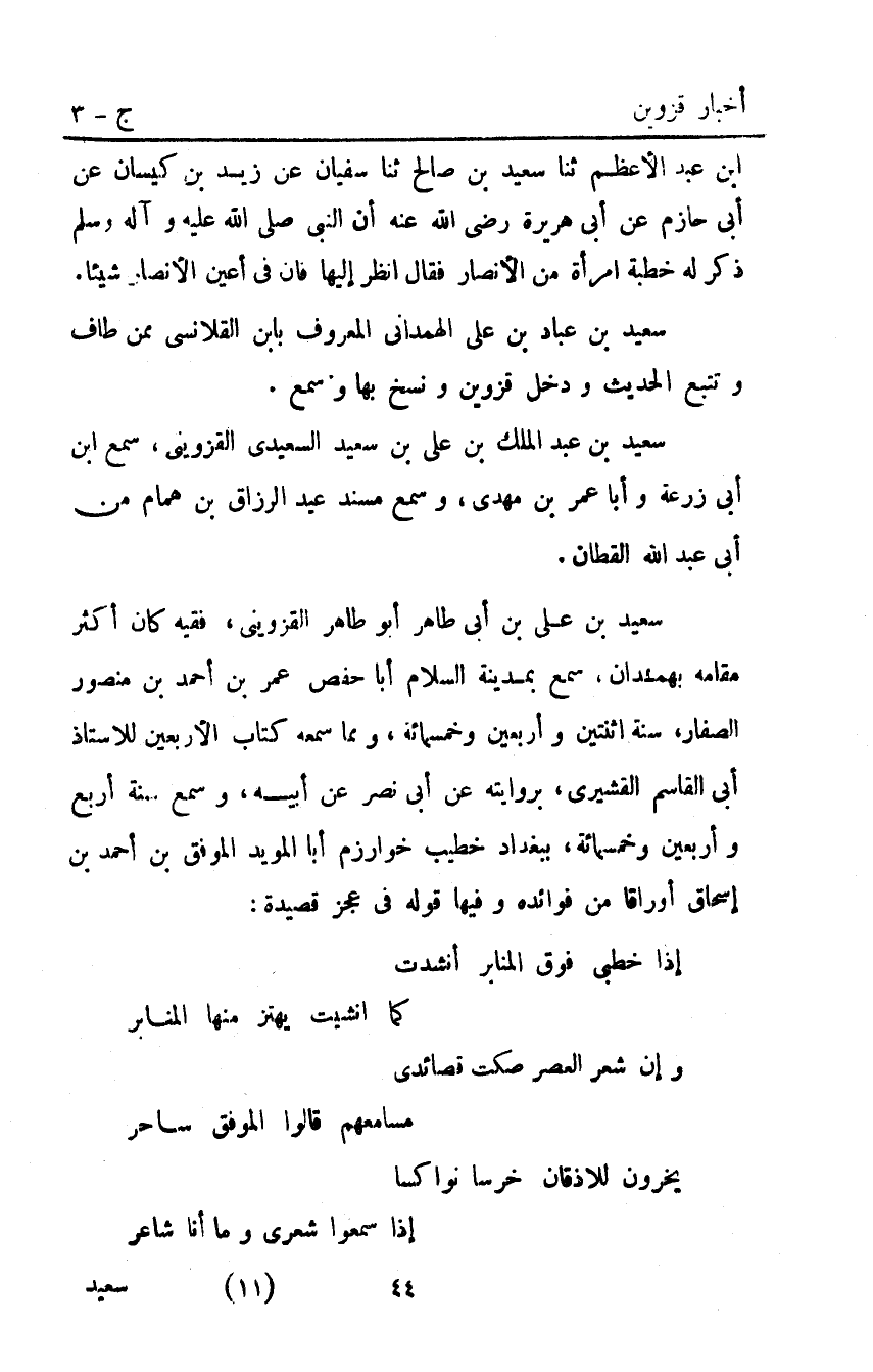 سعيد بْن علي بْن أبي طاهر أَبُو طاهر القزويني فقيه كان أكثر مقامه بهمدان سمع بمدينة السلام أبا حفص عمر بْن أحمد بْن منصور الصفار سنة اثنتين وأربعين وخمسمائة ومما سمعه كتاب الأربعين للأستاذ أَبِي الْقَاسِمِ الْقُشَيْرِيِّ بِرِوَايَتِهِ عَنْ أبي نصر عن أبيه وسمع سنة أربع وأربعين وخمسمائة ببغداد خطيب خوارزم أبا المويد الموفق بْن أحمد بْن إسحاق أوراقا من فوائده وفيها قوله في عجز قصيدة: