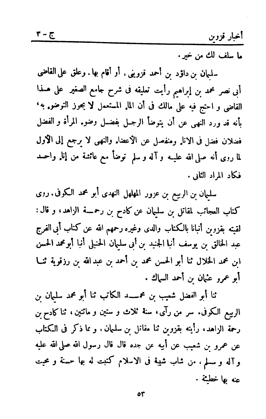 سليمان بن داؤد بْن أحمد قزويني أو أقام بها وعلق على القاضي أبي نصر محمد بْن إبراهيم رأيت تعليقه في شرح جامع الصغير على هذا القاضي واحتج فيه على مالك في أن الماء المستعمل لا يجوز التوضوء به بأنه قد ورد النهي عن أن يتوضأ الرجل بفضل وضوء المرأة والفضل فضلان فضل في الإناء ومنفصل عن الأعضاء والنهي لا يرجع إلى الأول لما روى أنه توضأ مع عائشة من إناء واحد فكاد المراد الثاني.