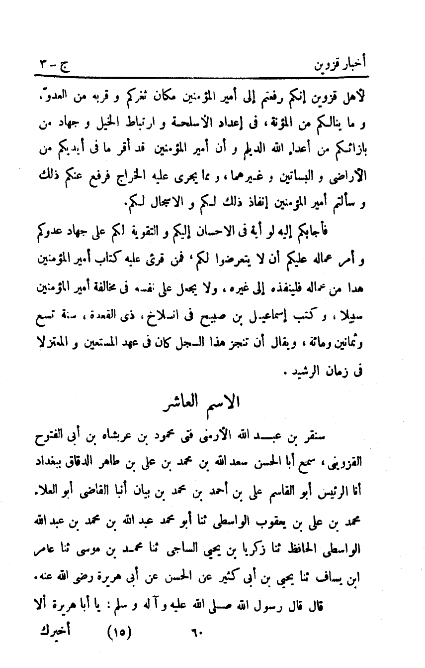 لأهل قزوين إنكم رفعتم إلى أمير المؤمنين مكان ثغركم وقربه من العدو وما ينالكم من المؤنة في إعداد الأسلحة وارتباط الخيل وجهاد من بازائكم من أعداء اللَّه الديلم وأن أمير المؤمنين قد أقر مَا في أيديكم من الأراضي والبساتين وغيرهما ومما يجرى عليه الخراج فرفع عنكم ذلك وسألتم أمير المؤمنين إنفاذ ذلك لكم والإسجال لكم.