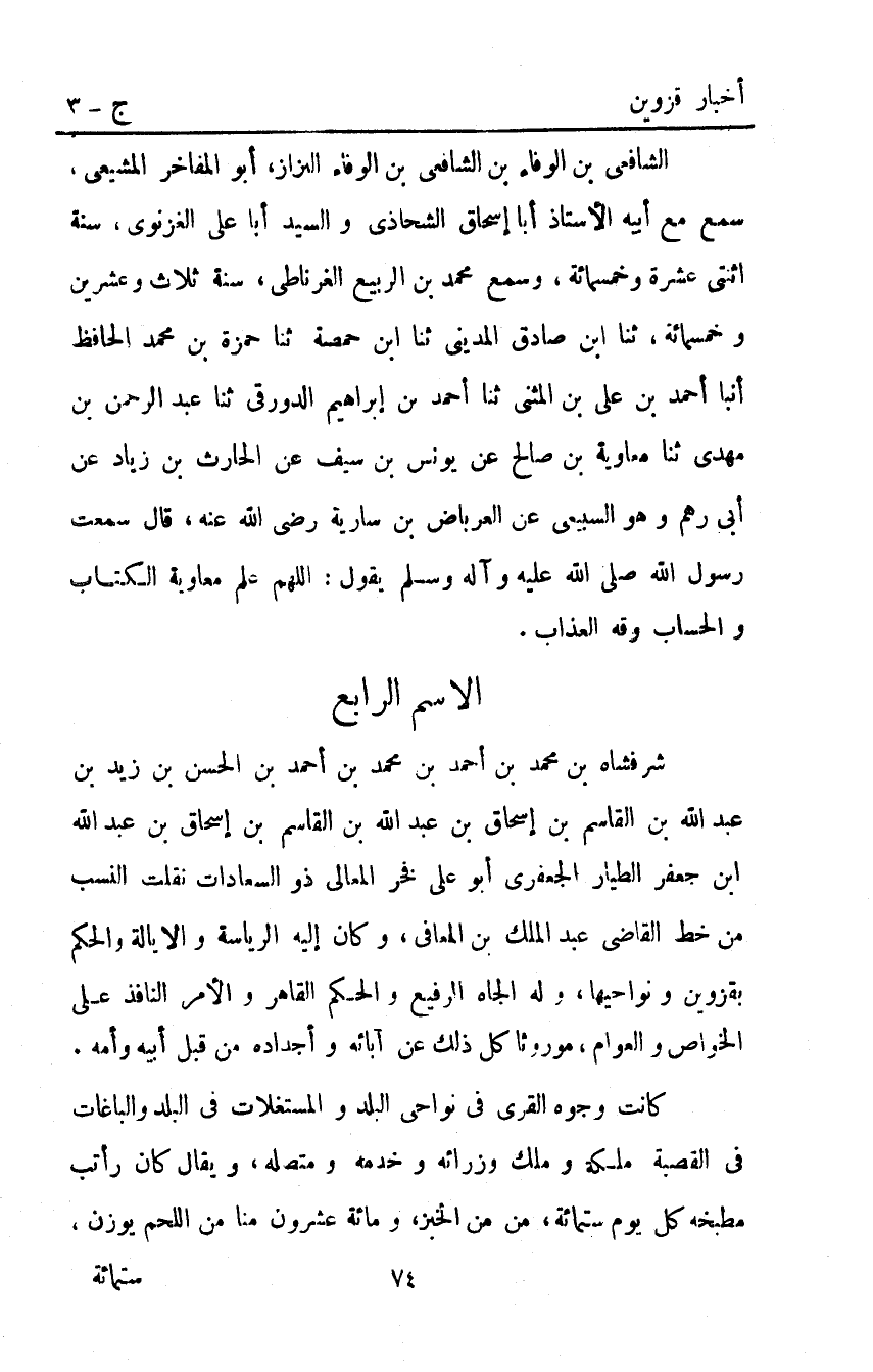 الشافعي بْنُ الْوَفَاءِ بْنِ الشَّافِعِيِّ بْنِ الْوَفَاءِ الْبَزَّازُ أَبُو الْمُفَاخِرِ الْمُشَيِّعِيُّ سَمِعَ مَعَ أَبِيهِ الأُسْتَاذِ أَبَا إِسْحَاق الشَّحَّاذِيَّ وَالسَّيِّدَ أَبَا عَلِيٍّ الغزنوى سنة أثنتى عشرة وخمسمائة وَسَمِعَ مُحَمَّدَ بْنَ الرَّبِيعِ الْغَرْنَاطِيَّ سنة ثلاث وعشرين وخسمائة ثَنَا ابْنُ صَادِقٍ الْمَدِينِيُّ ثَنَا ابْنُ حِمَّصَةَ ثَنَا حَمْزَةُ بْنُ مُحَمَّدٍ الْحَافِظُ أنبا أَحْمَد بْنُ عَلِيِّ بْنِ الْمُثَنَّى ثَنَا أَحْمَد بْنُ إبراهيم الدَّوْرَقِيُّ ثَنَا عَبْدُ الرَّحْمَنِ بْنُ مَهْدِيٍّ ثَنَا مُعَاوِيَةُ بْنُ صَالِحٍ عَنْ يُونُسَ بْنِ سَيْفٍ عَنِ الْحَارِثِ بْنِ زِيَادٍ عَنْ أَبِي رُهْمٍ وَهُوَ السَّبِيعِيُّ عَنِ الْعِرْبَاضِ بْنِ سَارِيَةَ رَضِي اللَّهُ عَنْهُ قَالَ سَمِعْتُ رَسُولَ اللَّهِ صَلَّى اللَّهُ عَلَيْهِ وَآلِهِ وَسَلَّمَ يَقُولُ: "اللَّهُمَّ عَلِّمْ مُعَاوِيَةَ الكتاب والحساب وقه العذاب".