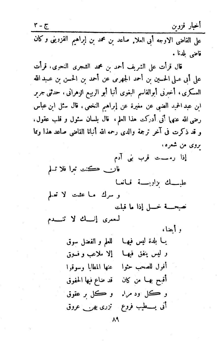قَالَ قَرَأْتُ عَلَى الشَّرِيفِ أَحْمَد بْنِ مُحَمَّدٍ الشَّجَرِيِّ النَّحْوِيِّ قَرَأْتُ عَلَى أبي عَلَى الحسين بْن أَحْمَد الْجَهْرَمِيِّ عَنْ أَحْمَد بْنِ الْحَسَنِ بْنِ عَبْدِ اللَّهِ الْعَسْكَرِيِّ أَخْبَرَنِي أَبُو الْقَاسِمِ الْبَغَوِيُّ أنبا أَبُو الربيع الزهراني حدثني جرير ابن عَبْدِ الْحَمِيدِ الضَّبِّيُّ عَنْ مُغِيرَةَ عَنْ إبراهيم النَّخَعِيِّ قَالَ سُئِلَ ابن عَبَّاس رَضِيَ اللَّهُ عَنْهُمَا أَنَّى أَدْرَكْتَ هَذَا الْعِلْمَ قَالَ: بلسان سئول وَقَلْبٍ عَقُولٍ وقد ذكرت في آخر ترجمة والدي رحمة اللَّه أَنْبَأَنَا القاضي صاعد هذا ومما يروى من شعره:
