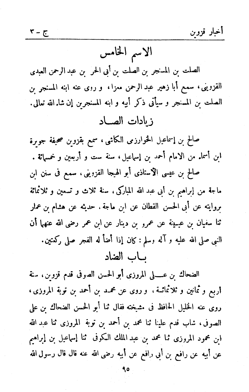صالح بْن عيسى الأستاذي أَبُو الهيجاء القزويني سمع في سنن ابن ماجه من إبراهيم بْن أبي عَبْد اللَّهِ المباركي سنة ثلاث وتسعين وثلاثمائة بِرِوَايَتِهِ عَنْ أَبِي الْحَسَنِ الْقَطَّانِ عن ابن ماجه حديثه عن هشام بْن عمار ثنا سفيان بْنُ عُيَيْنَةَ عَنْ عَمْرِو بْنِ دِينَارٍ عَنِ ابْنِ عُمَرَ رَضِيَ اللَّهُ عَنْهُمَا أَنَّ النَّبِيَّ صَلَّى اللَّهُ عَلَيْهِ وَآلِهِ وَسَلَّمَ: كَانَ إذا أضأ له الفجر صلى ركعتين.