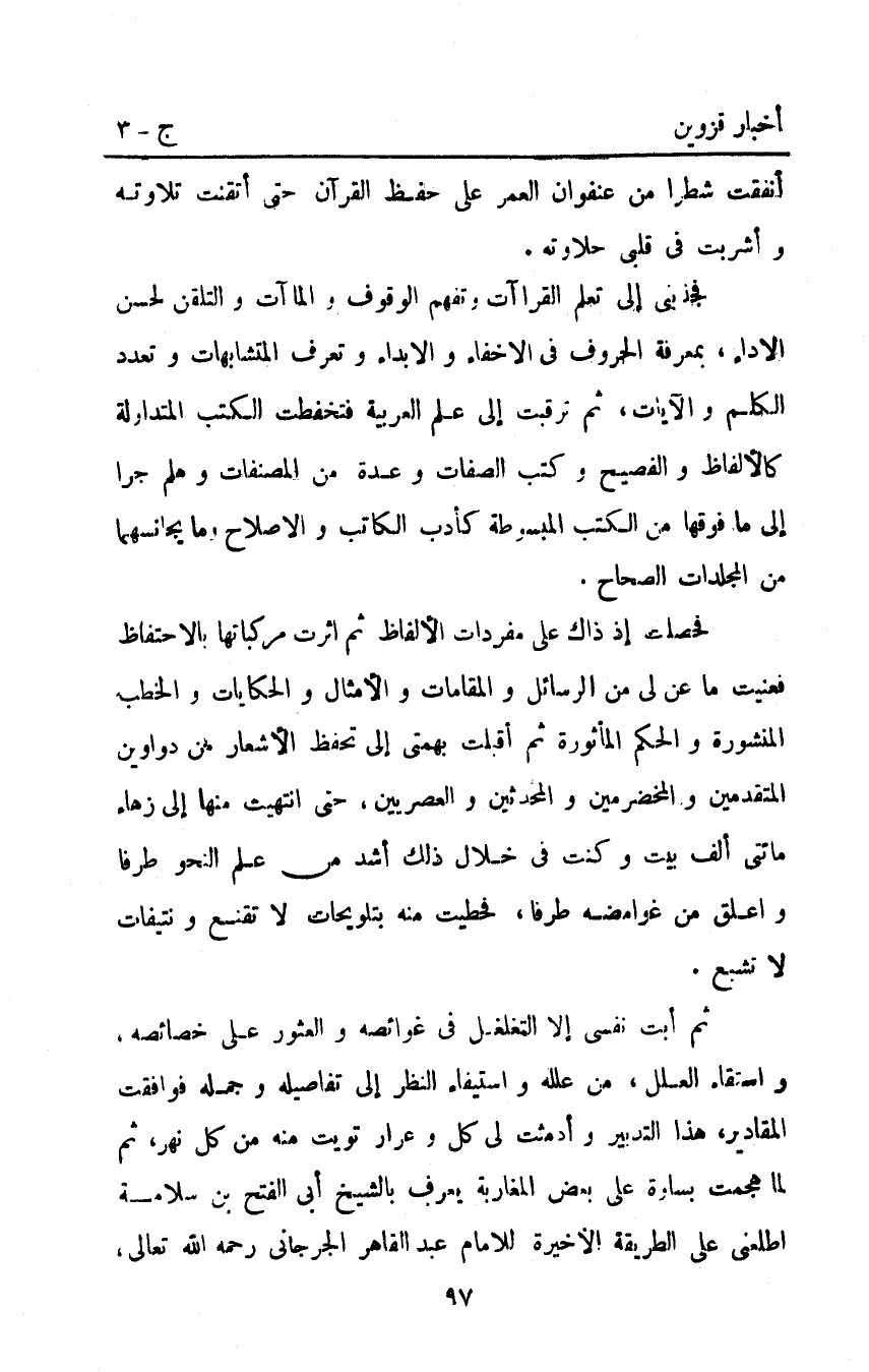 فجذبني إلى تعلم القراآت وتفهم الوقوف الماآت والتلقن لحسن الأداء بمعرفة الحروف في الإخفاء والإبداء وتعرف المتشابهات وتعدد الكلم والآيات ثم ترقبت إلى علم العربية فتخفطت الكتب المتداولة كالألفاظ والفصيح وكتب الصفات وعدة من المصنفات وهلم جرا إلى مَا فوقها من الكتب المبسوطة كأدب الكاتب والإصلاح وما يجانسهما من المجلدات الصحاح.