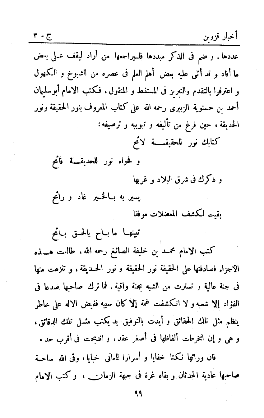 عددها وضم في الذكر مبددها فليراجعها من أراد ليقف على بعض مَا أفاد وقد أثنى عليه بعض أهل العلم في عصره من الشيوخ والكهول واعترفوا بالتقدم والتبريز في المستنبط والمنقول فكتب الإمام أَبُو سليمان أحمد بْن حسنويه الزبيري رحمه اللَّه على كتاب المعروف بنور الحقيقة ونور الحديقة حين فرغ من تأليفه وتبويبه وترصيفه: