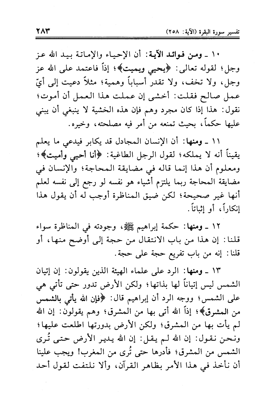 ١٣ - ومنها: الرد على علماء الهيئة الذين يقولون: إن إتيان الشمس ليس إتياناً لها بذاتها؛ ولكن الأرض تدور حتى تأتي هي على الشمس؛ ووجه الرد أن إبراهيم قال: {فإن الله يأتي بالشمس من المشرق}؛ إذاً الله أتى بها من المشرق؛ وهم يقولون: إن الله لم يأت بها من المشرق؛ ولكن الأرض بدورتها اطلعت عليها؛ ونحن نقول: إن الله لم يقل: إن الله يدير الأرض حتى تُرى الشمس من المشرق؛ فأدرها حتى تُرى من المغرب! ويجب علينا أن نأخذ في هذا الأمر بظاهر القرآن، وألا نلتفت لقول أحد