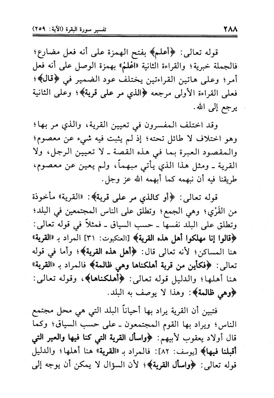 وقد اختلف المفسرون في تعيين القرية، والذي مر بها؛ وهو اختلاف لا طائل تحته؛ إذ لم يثبت فيه شيء عن معصوم؛ والمقصود العبرة بما في هذه القصة - لا تعيين الرجل، ولا القرية - ومثل هذا الذي يأتي مبهماً، ولم يعين عن معصوم، طريقنا فيه أن نبهمه كما أبهمه الله عز وجل.
