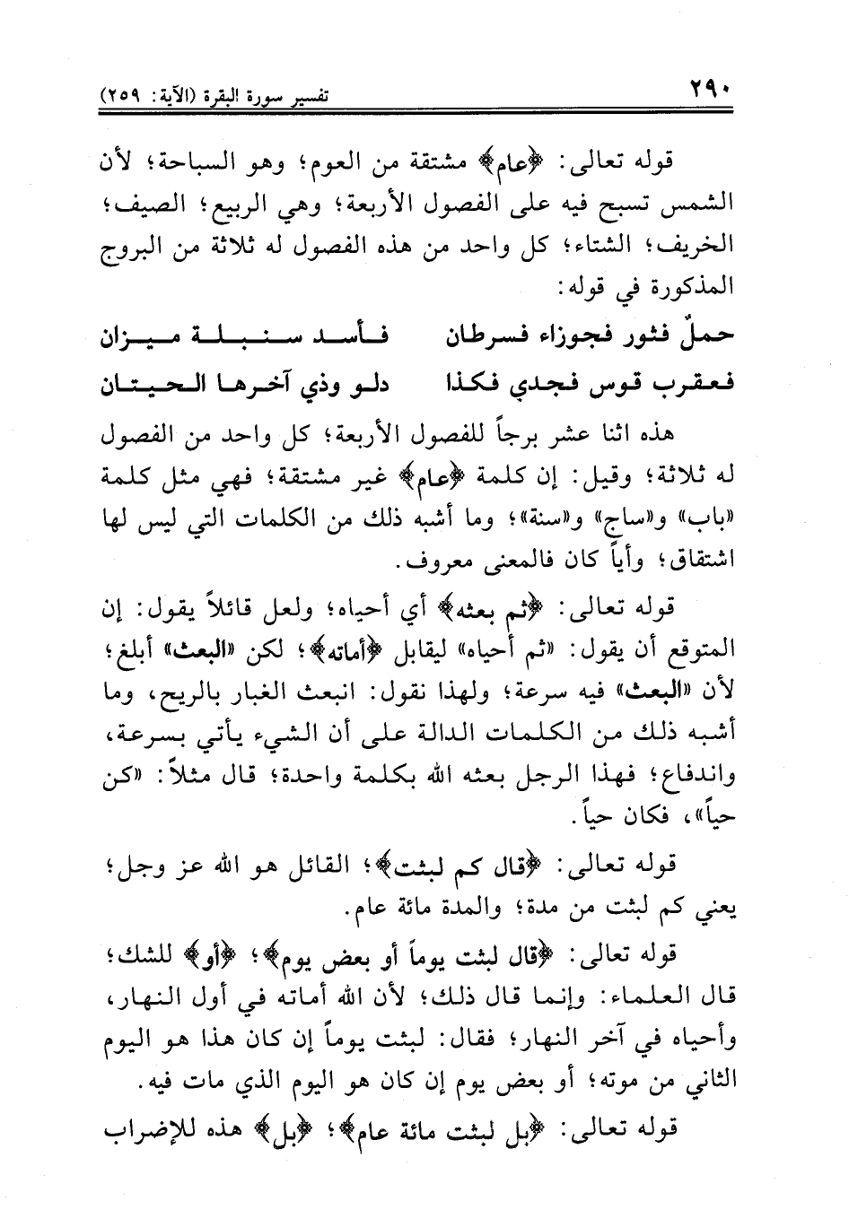 (حملٌ فثور فجوزاء فسرطان فأسد سنبلة ميزان فعقرب قوس فجدي فكذا دلو وذي آخرها الحيتان) هذه اثنا عشر برجاً للفصول الأربعة؛ كل واحد من الفصول له ثلاثة؛ وقيل: إن كلمة {عام} غير مشتقة؛ فهي مثل كلمة «باب» و «ساج» و «سنة»؛ وما أشبه ذلك من الكلمات التي ليس لها اشتقاق؛ وأياً كان فالمعنى معروف.