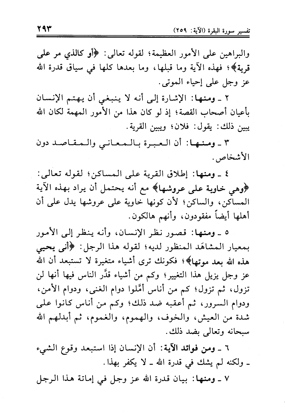 ٢ - ومنها: الإشارة إلى أنه لا ينبغي أن يهتم الإنسان بأعيان أصحاب القصة؛ إذ لو كان هذا من الأمور المهمة لكان الله يبين ذلك: يقول: فلان؛ ويبين القرية.