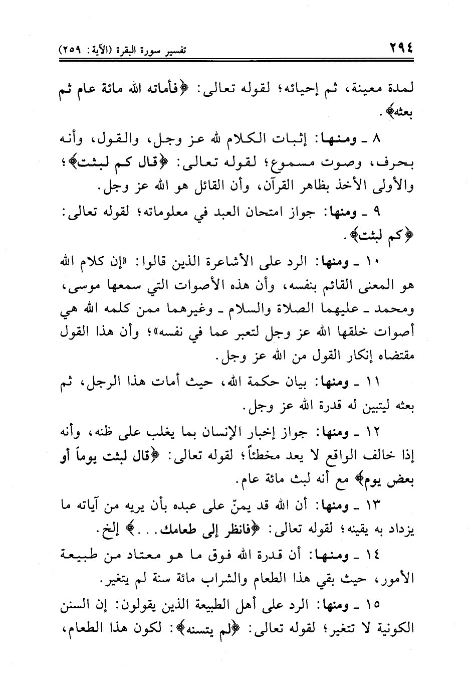 ١١ - ومنها: بيان حكمة الله، حيث أمات هذا الرجل، ثم بعثه ليتبين له قدرة الله عز وجل.