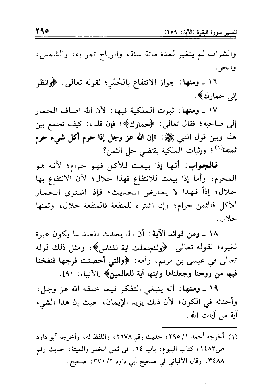 ١٧ - ومنها: ثبوت الملكية فيها: لأن الله أضاف الحمار إلى صاحبه؛ فقال تعالى: {حمارك}؛ فإن قلت: كيف تجمع بين هذا وبين قول النبي صلى الله عليه وسلم: «إن الله عز وجل إذا حرم أكل شيء حرم ثمنه» (¬١)؛ وإثبات الملكية يقتضي حل الثمن؟