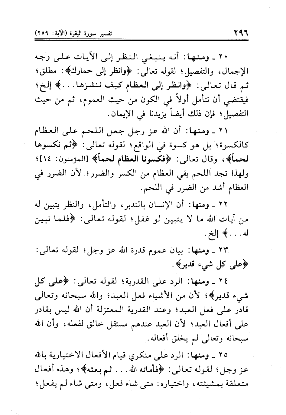 ٢٥ - ومنها: الرد على منكري قيام الأفعال الاختيارية بالله عز وجل؛ لقوله تعالى: {فأماته الله ... ثم بعثه}؛ وهذه أفعال متعلقة بمشيئته، واختياره: متى شاء فعل، ومتى شاء لم يفعل؛