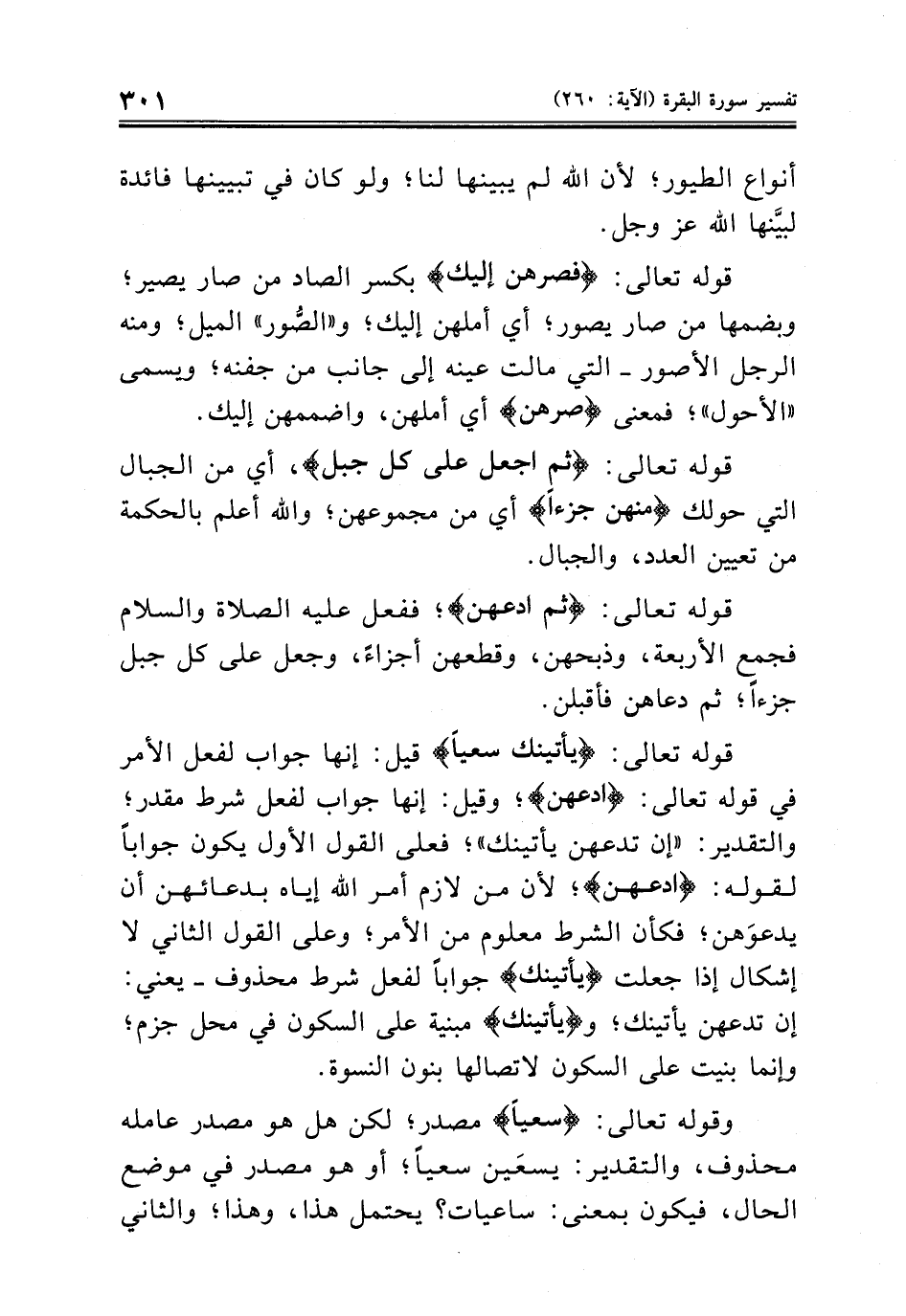 قوله تعالى: {ثم ادعهن}؛ ففعل عليه الصلاة والسلام فجمع الأربعة، وذبحهن، وقطعهن أجزاءً، وجعل على كل جبل جزءاً؛ ثم دعاهن فأقبلن.