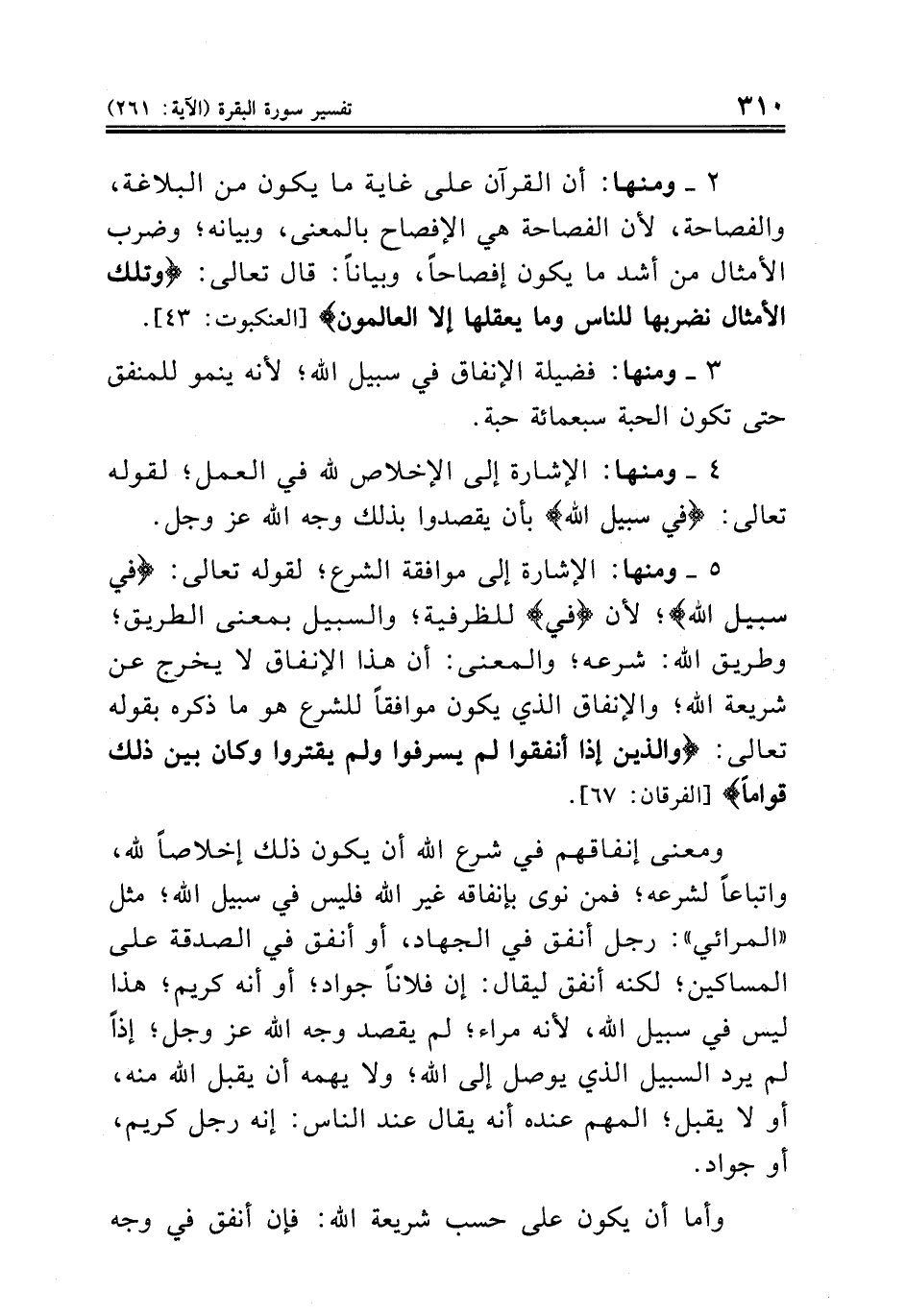 ٥ - ومنها: الإشارة إلى موافقة الشرع؛ لقوله تعالى: {في سبيل الله}؛ لأن {في} للظرفية؛ والسبيل بمعنى الطريق؛ وطريق الله: شرعه؛ والمعنى: أن هذا الإنفاق لا يخرج عن شريعة الله؛ والإنفاق الذي يكون موافقاً للشرع هو ما ذكره بقوله تعالى: {والذين إذا أنفقوا لم يسرفوا ولم يقتروا وكان بين ذلك قواماً} [الفرقان: ٦٧].