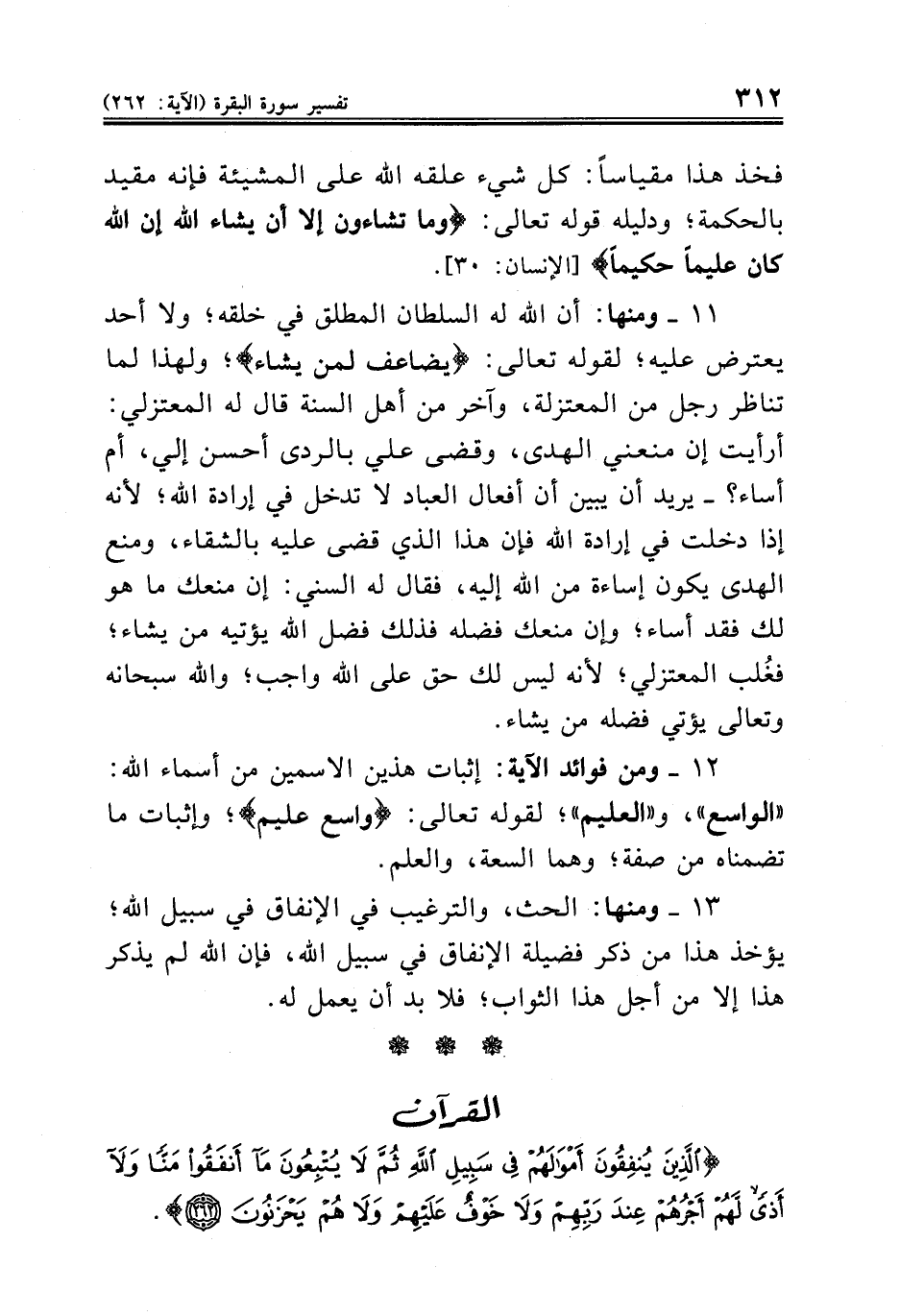 ١١ - ومنها: أن الله له السلطان المطلق في خلقه؛ ولا أحد يعترض عليه؛ لقوله تعالى: {يضاعف لمن يشاء}؛ ولهذا لما تناظر رجل من المعتزلة، وآخر من أهل السنة قال له المعتزلي: أرأيت إن منعني الهدى، وقضى علي بالردى أحسن إلي، أم أساء؟ - يريد أن يبين أن أفعال العباد لا تدخل في إرادة الله؛ لأنه إذا دخلت في إرادة الله فإن هذا الذي قضى عليه بالشقاء، ومنع الهدى يكون إساءة من الله إليه، فقال له السني: إن منعك ما هو لك فقد أساء؛ وإن منعك فضله فذلك فضل الله يؤتيه من يشاء؛ فغُلب المعتزلي؛ لأنه ليس لك حق على الله واجب؛ والله سبحانه وتعالى يؤتي فضله من يشاء.