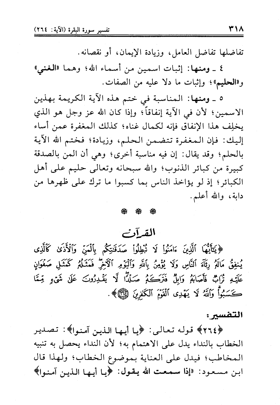 {٢٦٤} قوله تعالى: {يا أيها الذين آمنوا}: تصدير الخطاب بالنداء يدل على الاهتمام به؛ لأن النداء يحصل به تنبيه المخاطب؛ فيدل على العناية بموضوع الخطاب؛ ولهذا قال ابن مسعود: «إذا سمعت الله يقول: {يا أيها الذين آمنوا}